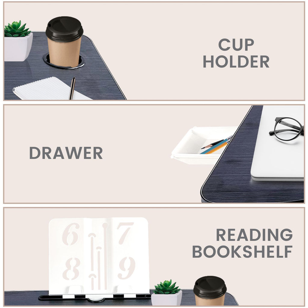 Comes with: bookshelf, cup holder, tablet holder, drawer