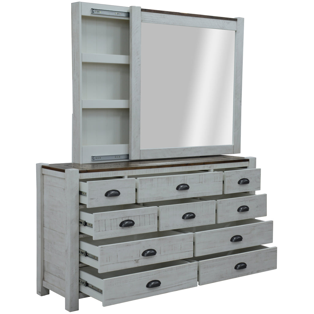 Place this beautiful dresser-mirror set in your bedroom and fill it with positivity, convenience, and happiness. The dresser and mirror, beautifully designed in the Hampton style, will make your life easier. The set has a rich look as it features a two-tone colour palette in a rough sawn finish. The set is multi-coloured with a brown rustic top and a distressed almond white base. The dresser improves storage space in your bedroom and gives it a clean appearance. It has massive storage space in the form of 10 sizable drawers - 5 large and 5 small, all with full-extension metal runners. The drawers have oval-shaped metal handles in an antique colour. The dresser has strong, thick legs, giving it strong support. The mirror is composed of shock-proof tempered glass and also has 3 hidden shelves in it. You can use the storage by sliding the mirror aside. Its slider runs on a metal runner that ensures its great functionality for a long time. The dresser-mirror set is made of high-quality solid Acacia wood, obtained in a sustainable manner. And this makes the set super-sturdy and long-lasting. The fully assembled dresser and mirror come with a one-year warranty.