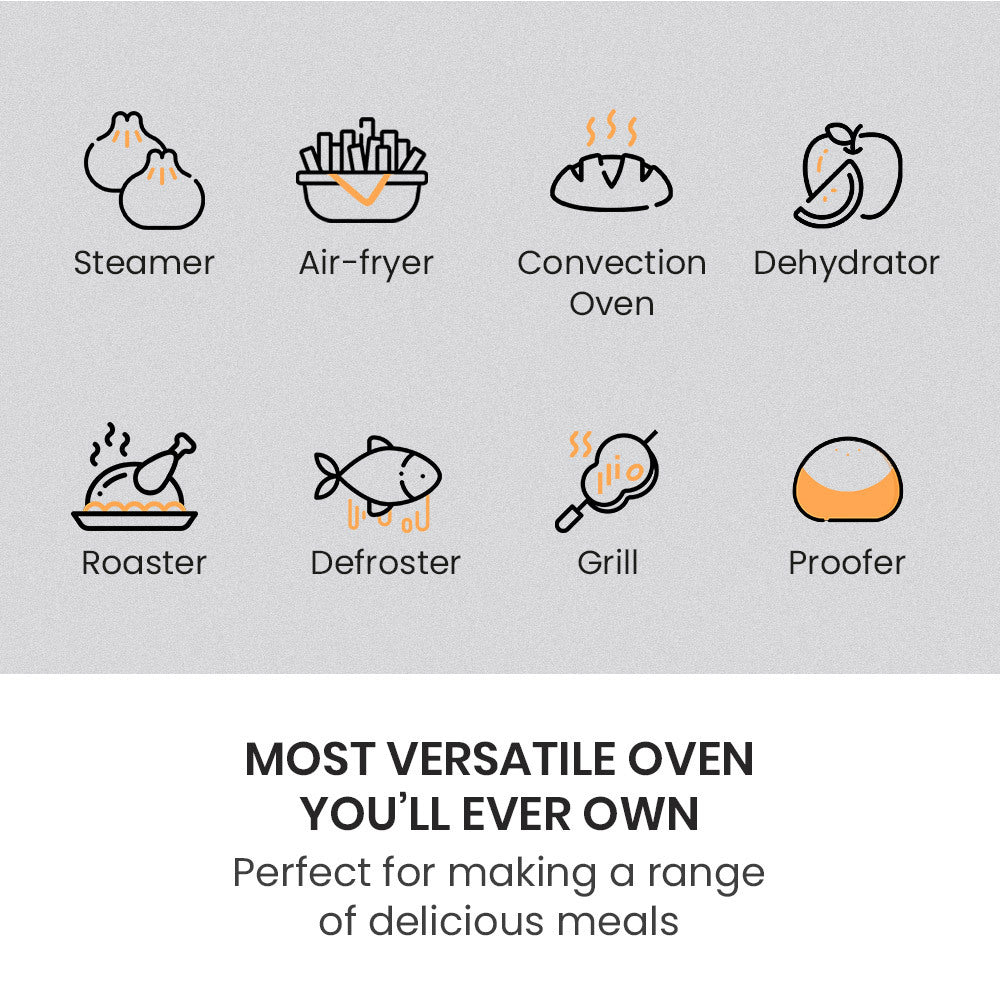 It offers Steam Roasting, Steaming, Air Frying, Baking, Roasting, Grilling, Defrosting, Dehydrating and Proofing! With steam this versatile appliance can cook up to 40% faster