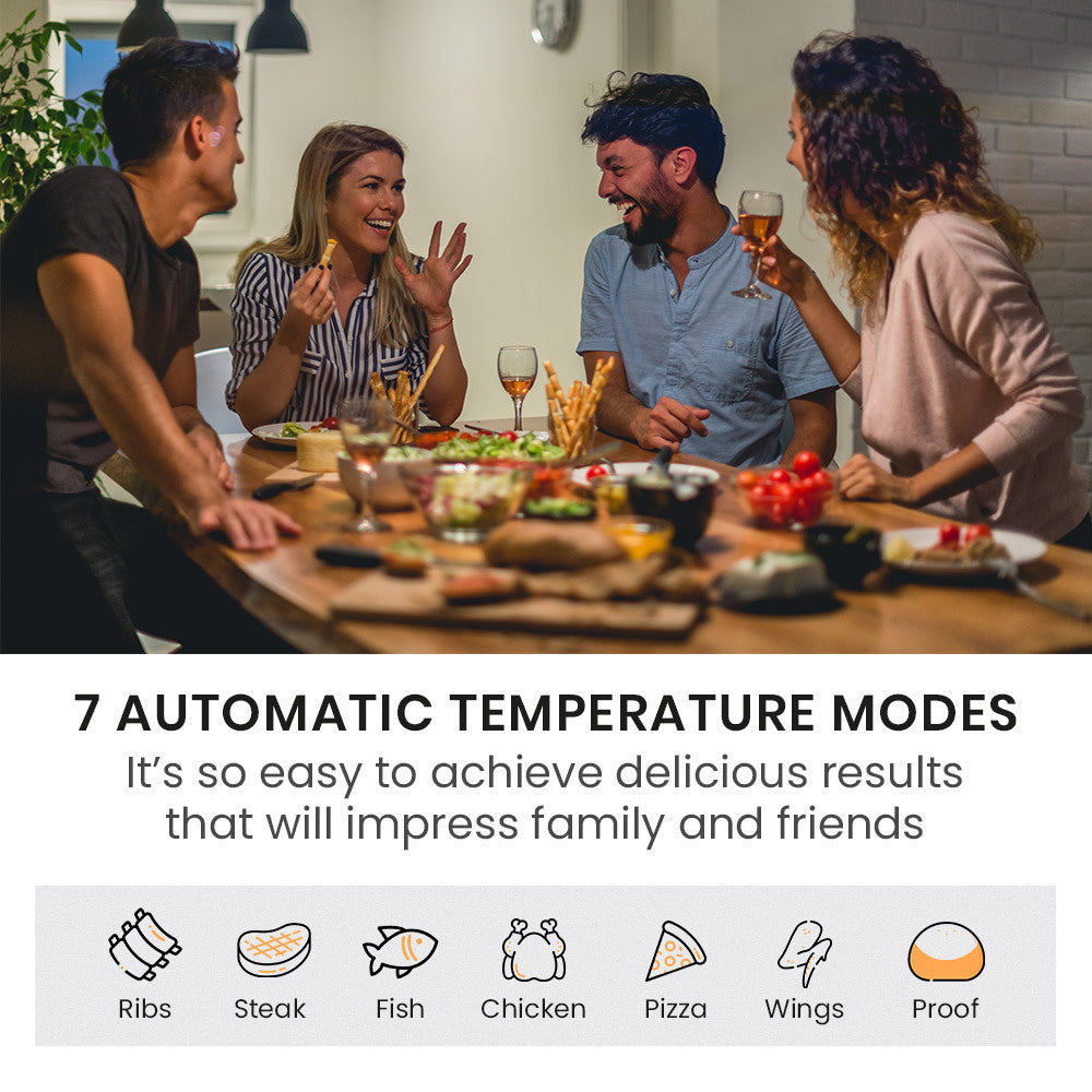 You can select from 7 temperature modes to cook foods like chicken, fish, steak and pizza. With the 3 modes; low temp steaming, standard baking/air frying and high temp steam cooking, you are just one touch away from serving up gourmet results.