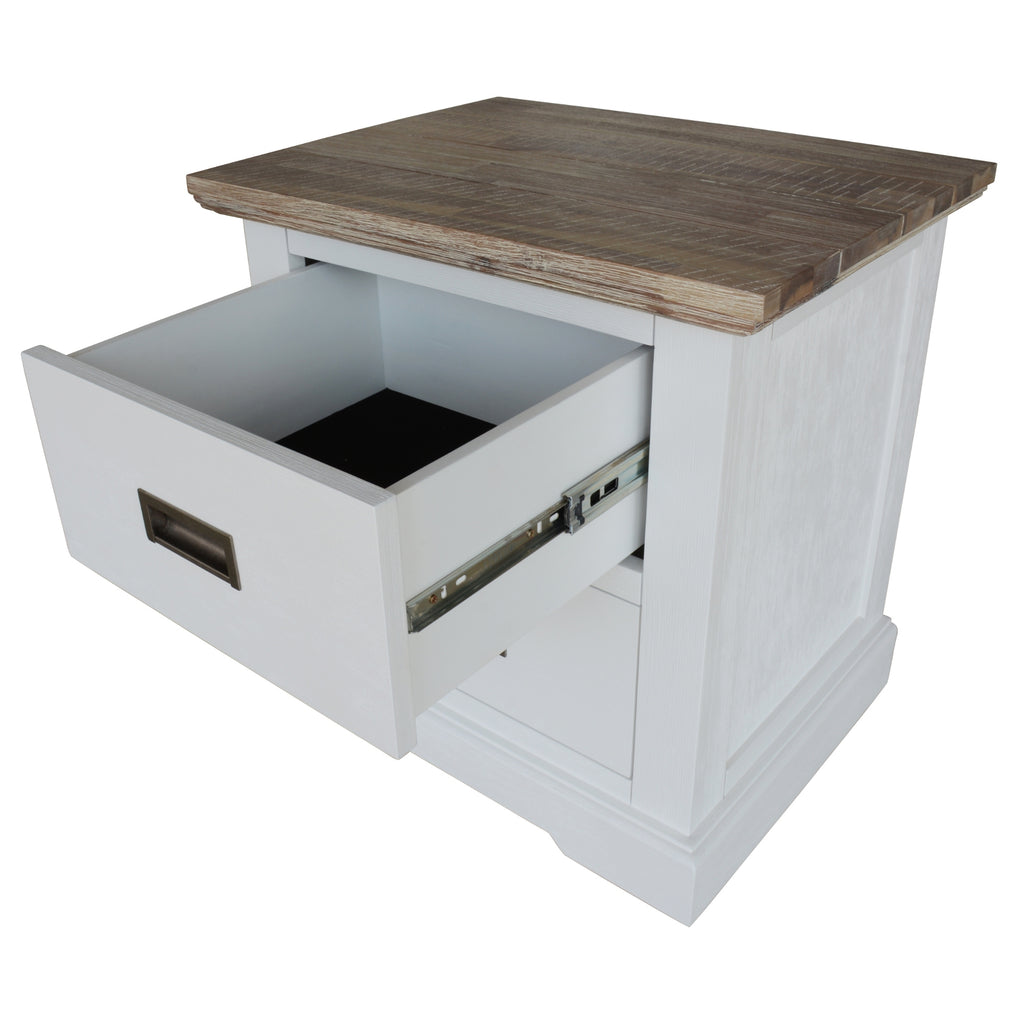 This good looking bedside crafted in the Hampton style, not only uplifts the charm of the bedroom but also helps keep it well-organised. The bedside table has 2 drawers, and it features multi-coloured acacia timber top, displaying different tones and hues. Both drawers have full metal extension runners and metal handles in an antique finish. The fully assembled furniture piece is made of sustainably harvested, solid acacia timber. The wood is known for its strength, shock resistance, durability, and ease of maintenance. Its multi-colour and white finish goes well with a variety of interior decor styles, and a one-year warranty is included with it.