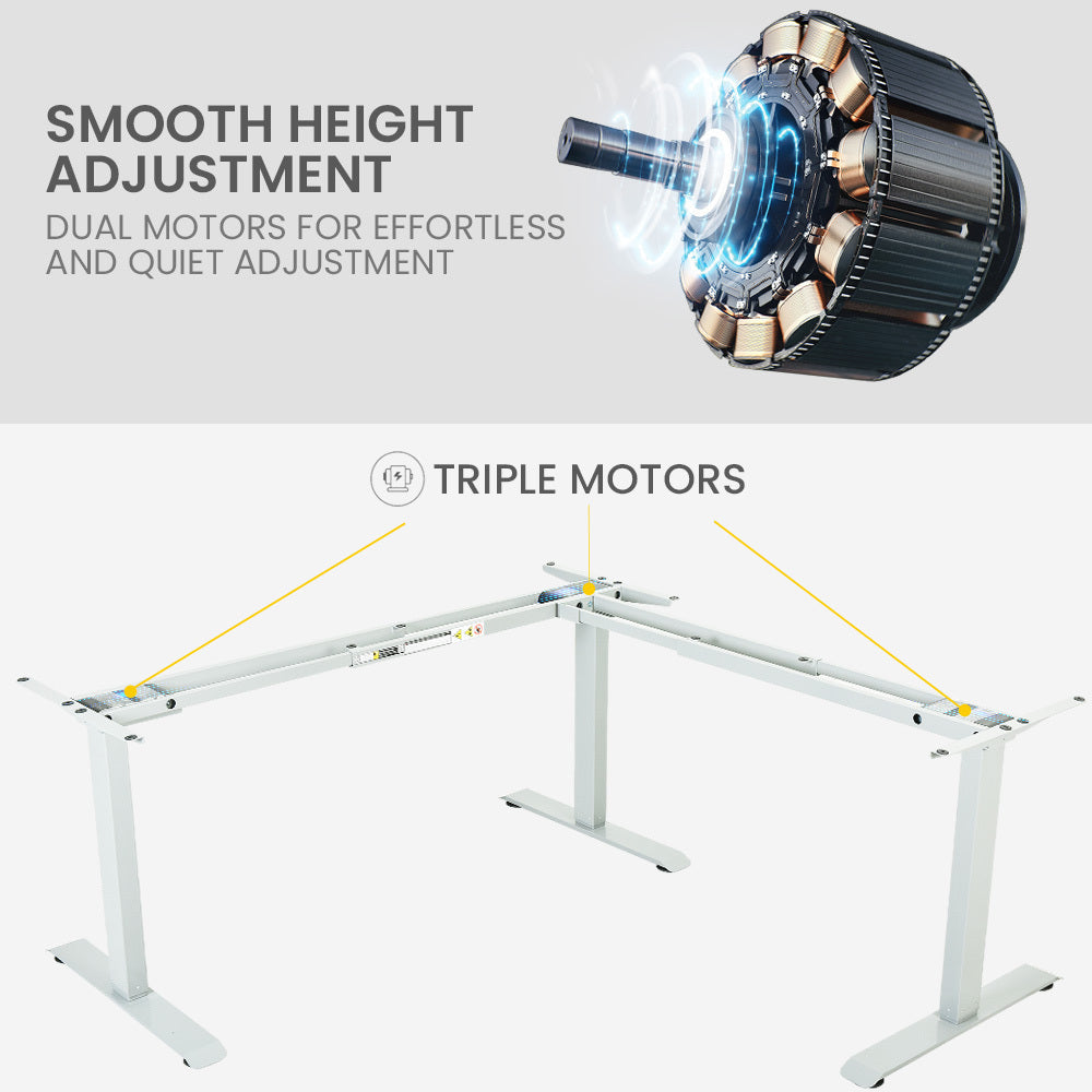 The FORTIA electric corner desk operates quickly, smoothly, and quietly with a triple motor system. It’s built to last, with a durable design that handles up to 120kg. The motors are discreetly housed within the frame for added safety and a sleek look.