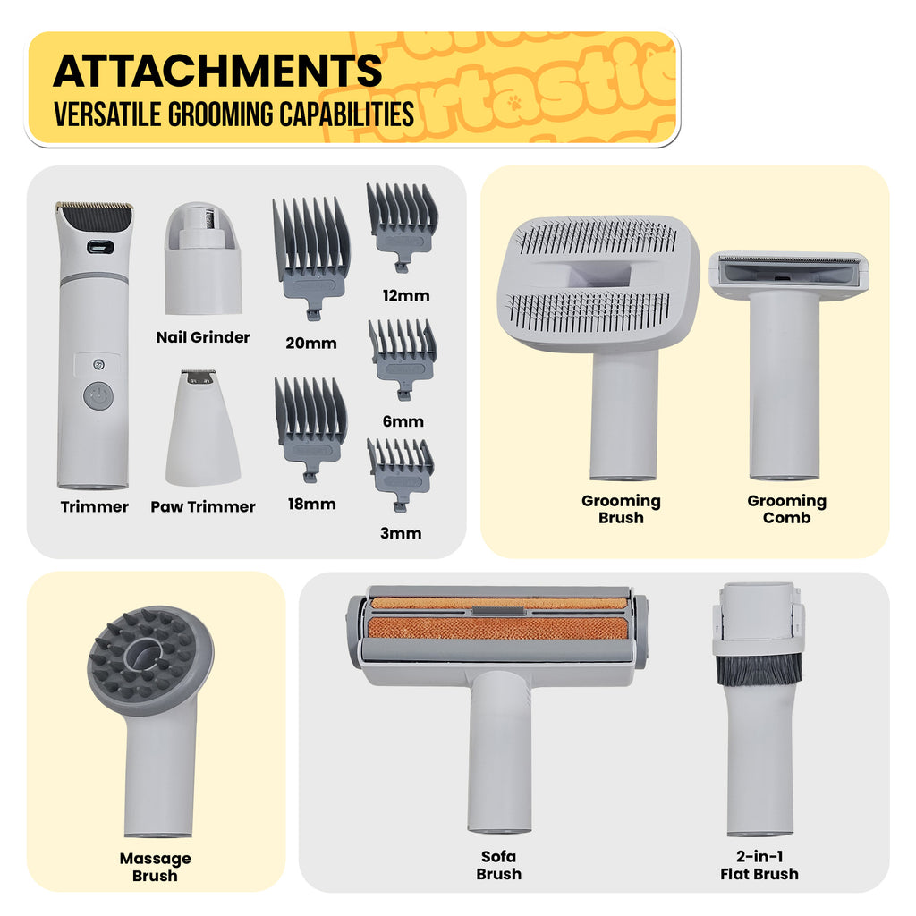 The Furtastic Pet Vacuum is the ultimate grooming solution for your furry companions! This all-in-one grooming kit is a powerhouse with 8 major function attachments: a large trimmer, paw trimmer, grooming brush, grooming comb, nail grinder, massage brush, sofa brush and crevice brush. It lets you trim and vacuum at the same time so that each grooming session is easy and mess-free.