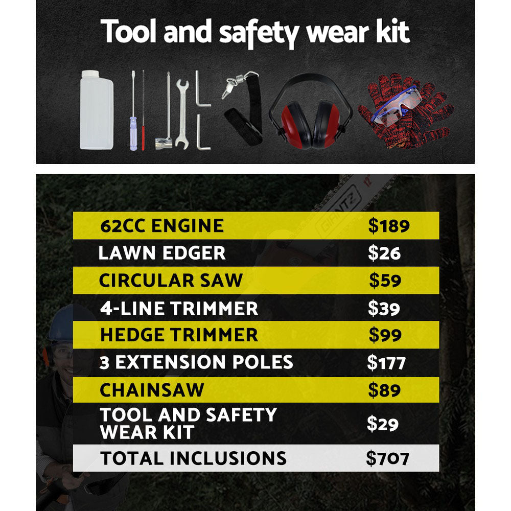 The latest GIANTZ 62cc Pro-Series Gardener is powerful and efficient and designed to cut, trim and sculpt with ease. It comprises a host of desirables features such as a super responsive motor, high capacity operations, in-built anti-vibration mechanism, auto chain lubricator, adjustable chain oil feed and easy start system. Plus, 26mm premium anodized commercial alloy is used for the shafts and poles and commercial grade quick connect couplings are equipped with dual ball-bearing floating centres to make operating the tools smooth and easy. Simply put, the GIANTZ Multi-tool Gardener is one tough dude with an easy working attitude.
