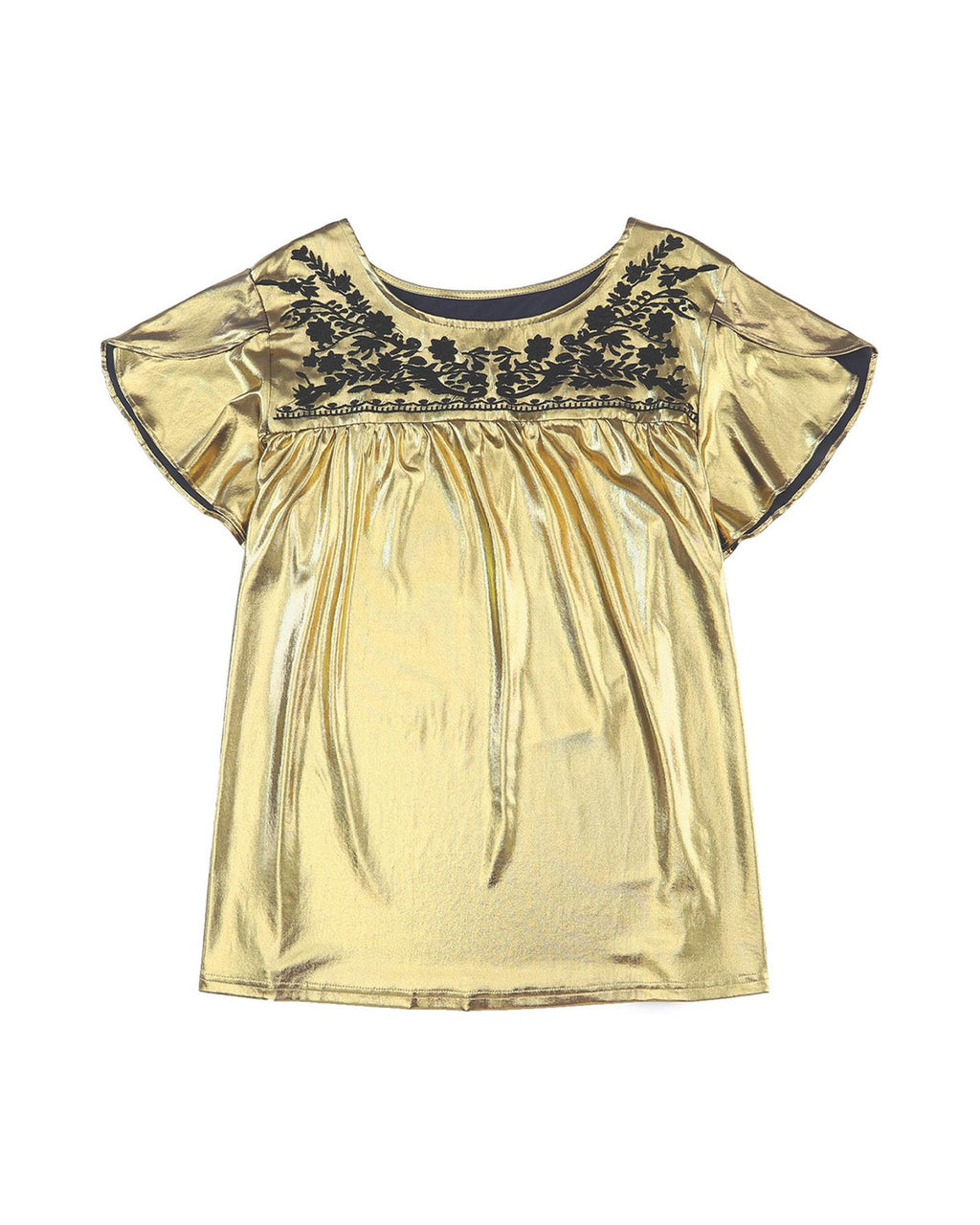 Gold Plus Size Floral Embroidered Short Sleeve Top - 1X