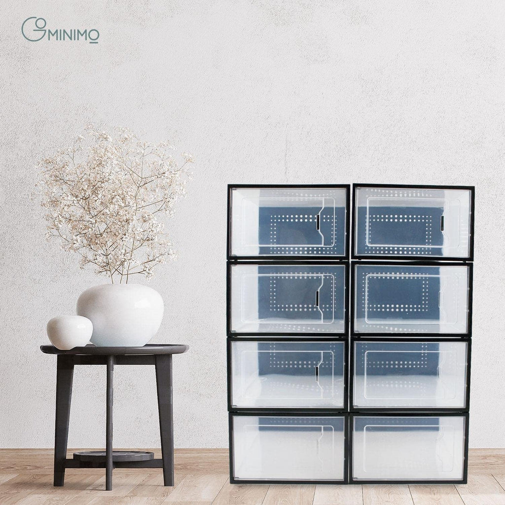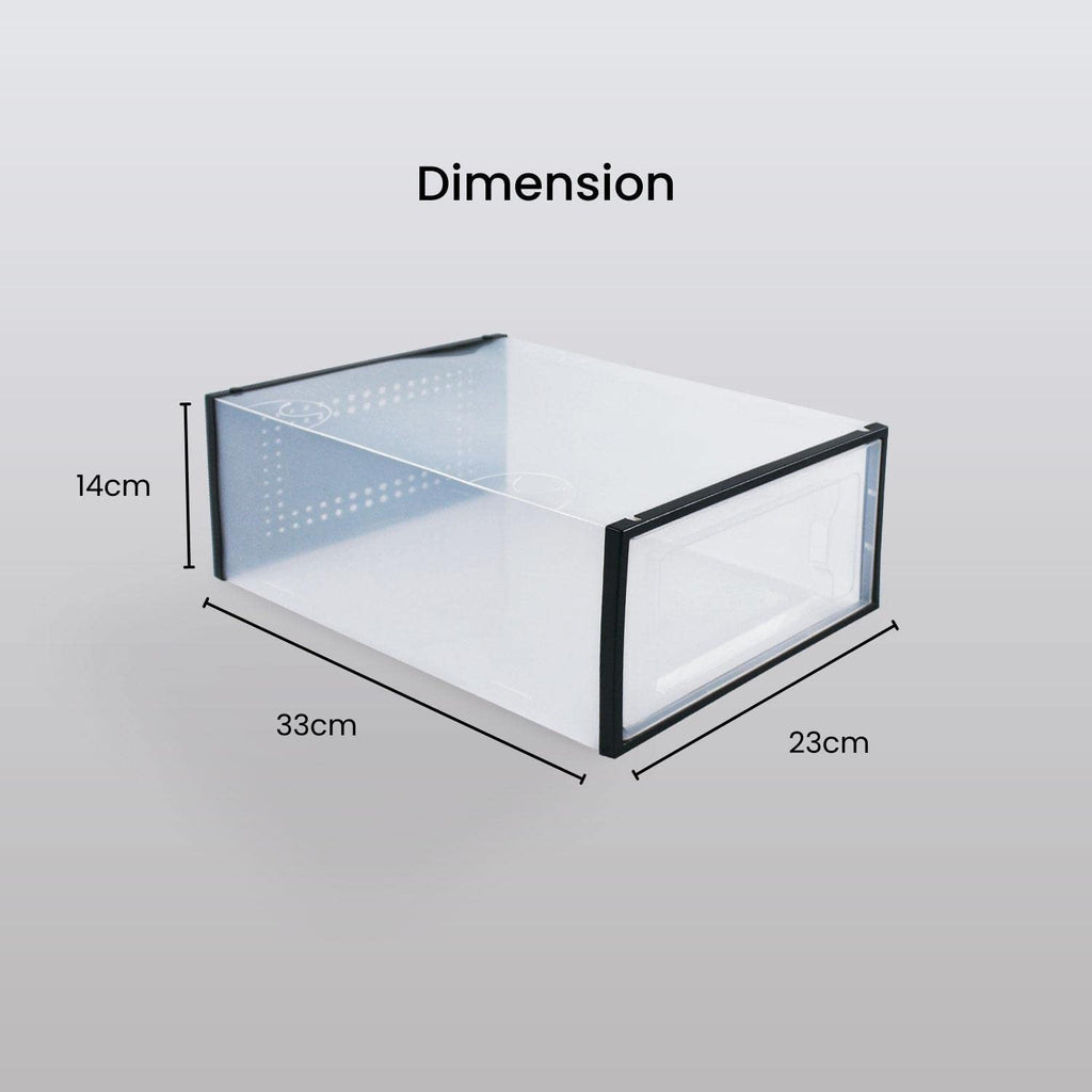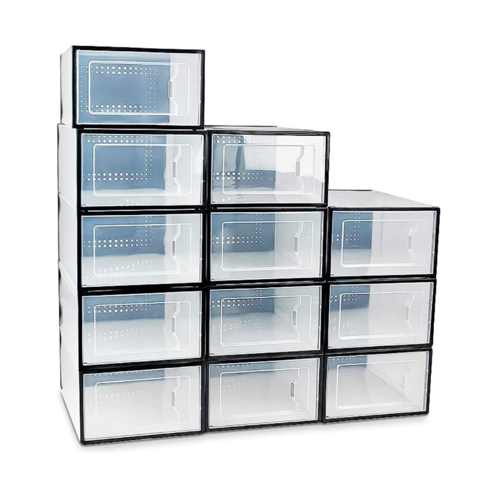 Assembled size of each shoe box is 33cm x 23cm x 14cm. Plastic box organizer package includes 12 packs of clear and black shoe rack box.
