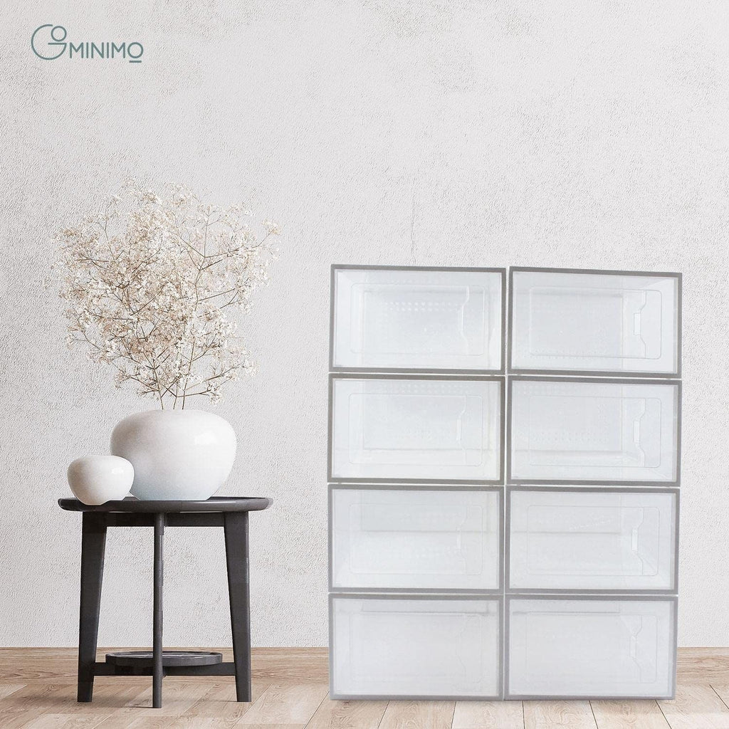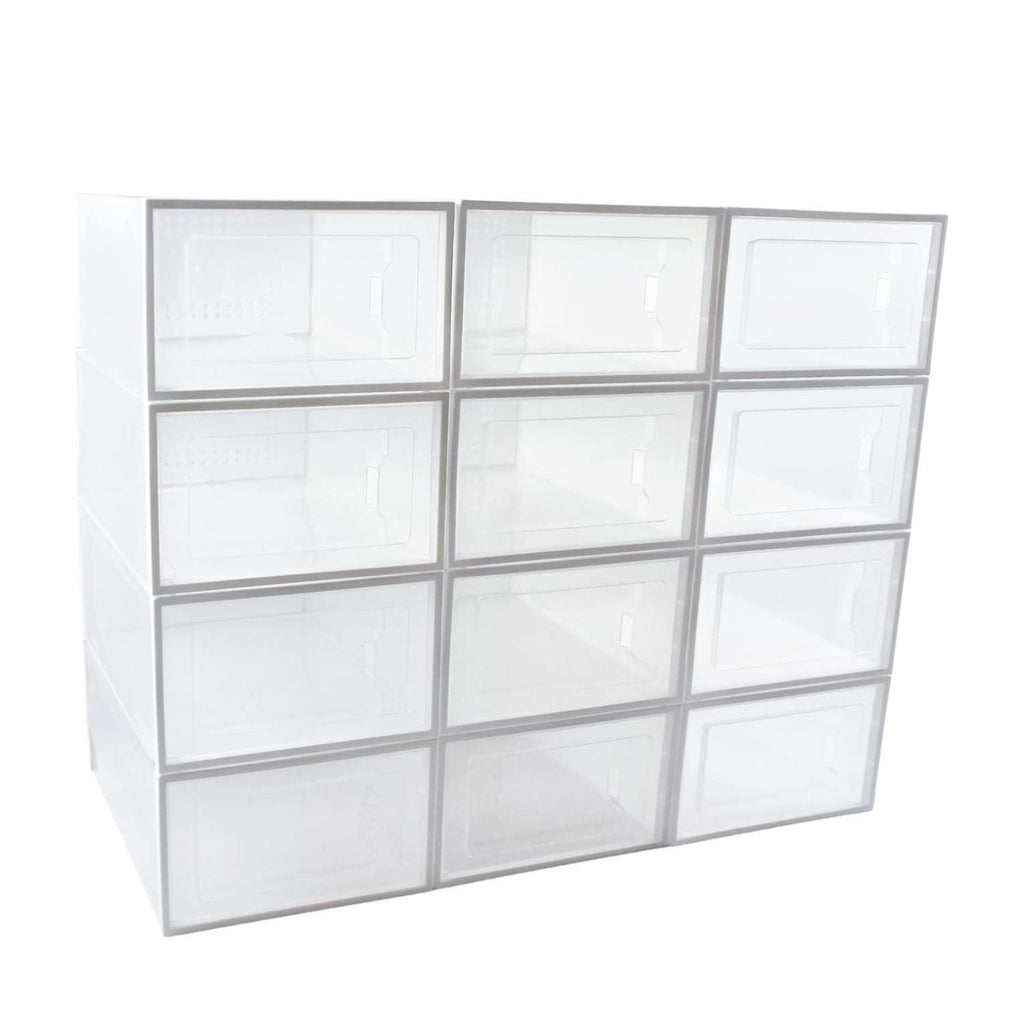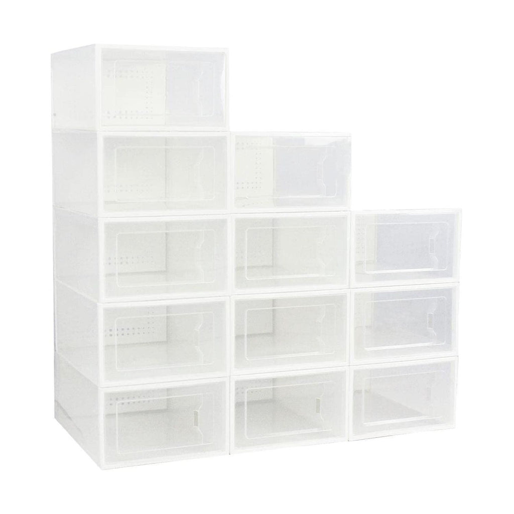 These 12 packs of clear and white shoe rack boxes are perfect for organizing your shoes. The boxes are made of durable plastic. With these boxes, you can easily see the shoes that are stored inside and keep them in a neat and tidy manner.