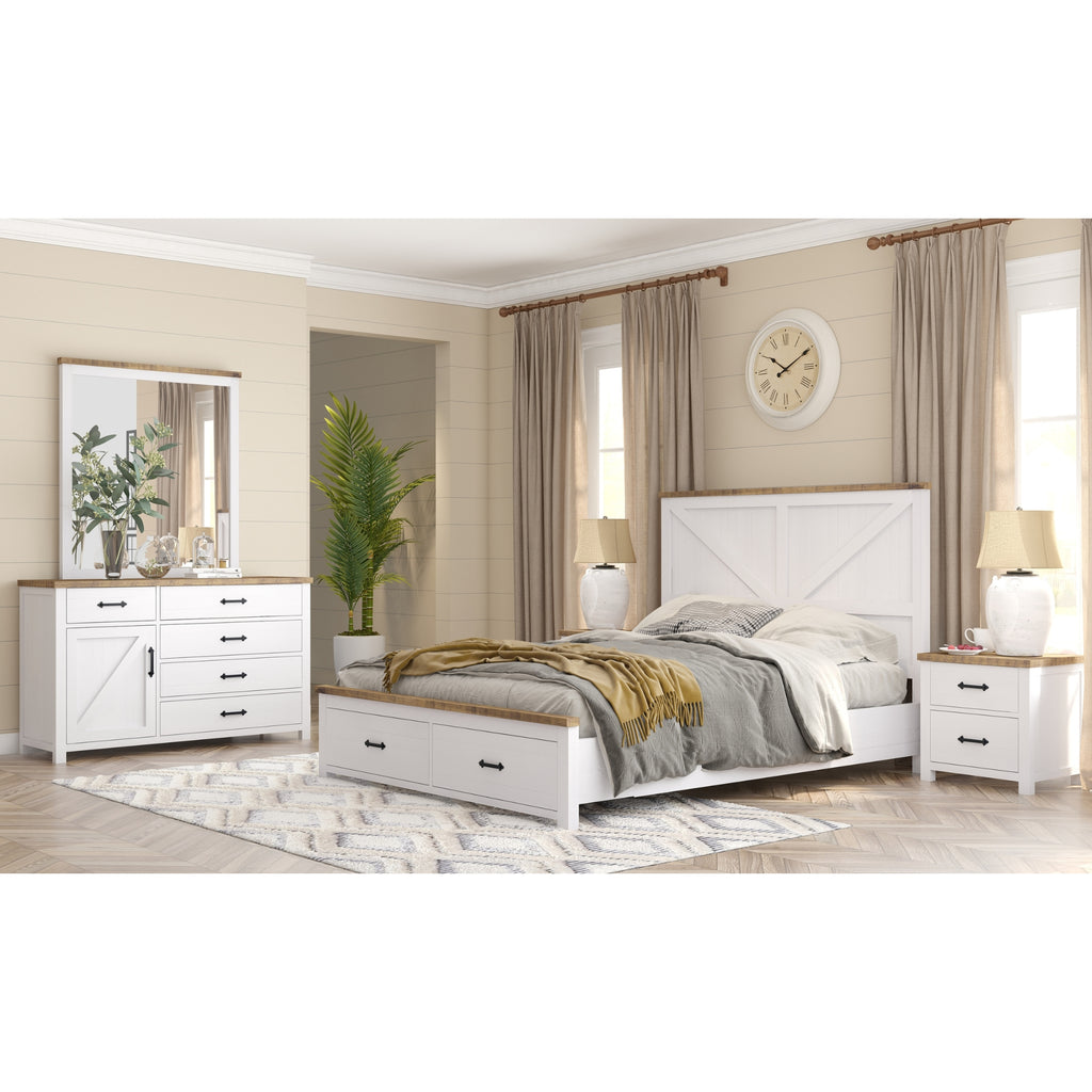 This king-bed dresser-mirror suite adds grandeur to the bedroom. Crafted in the Hampton style, the suite embellishes your space brilliantly. It not only turns the area into a relaxing haven but also helps keep it well organized. The suite consists of 1 king bed with 2 drawers with ample storage space at the footboard; 1 dresser with 5 drawers and 1 door, covering a sizable compartment; 1 mirror; and 2 bedside tables with 2 drawers each. All drawers have full-extension metal runners and black antique metal handles. The good-looking mirror is made of resilient, annealed glass, fitted into an equally beautiful wooden frame. A distinctive panelled headboard gives a classy look to the bed, and a solid wood slat system with central support legs gives it super robustness. Also, the whole furniture collection is made of solid pine wood, harvested in a sustainable way. The wood is known for its attractive looks, great strength, shock resistance, durability, and ease of maintenance. The collection features a white and contrasting natural top in a rough sawn finish that looks nice amid a variety of interior decor styles. The easy-to-assemble suite comes with a 1-year warranty. Only the bed needs assembly in the set.