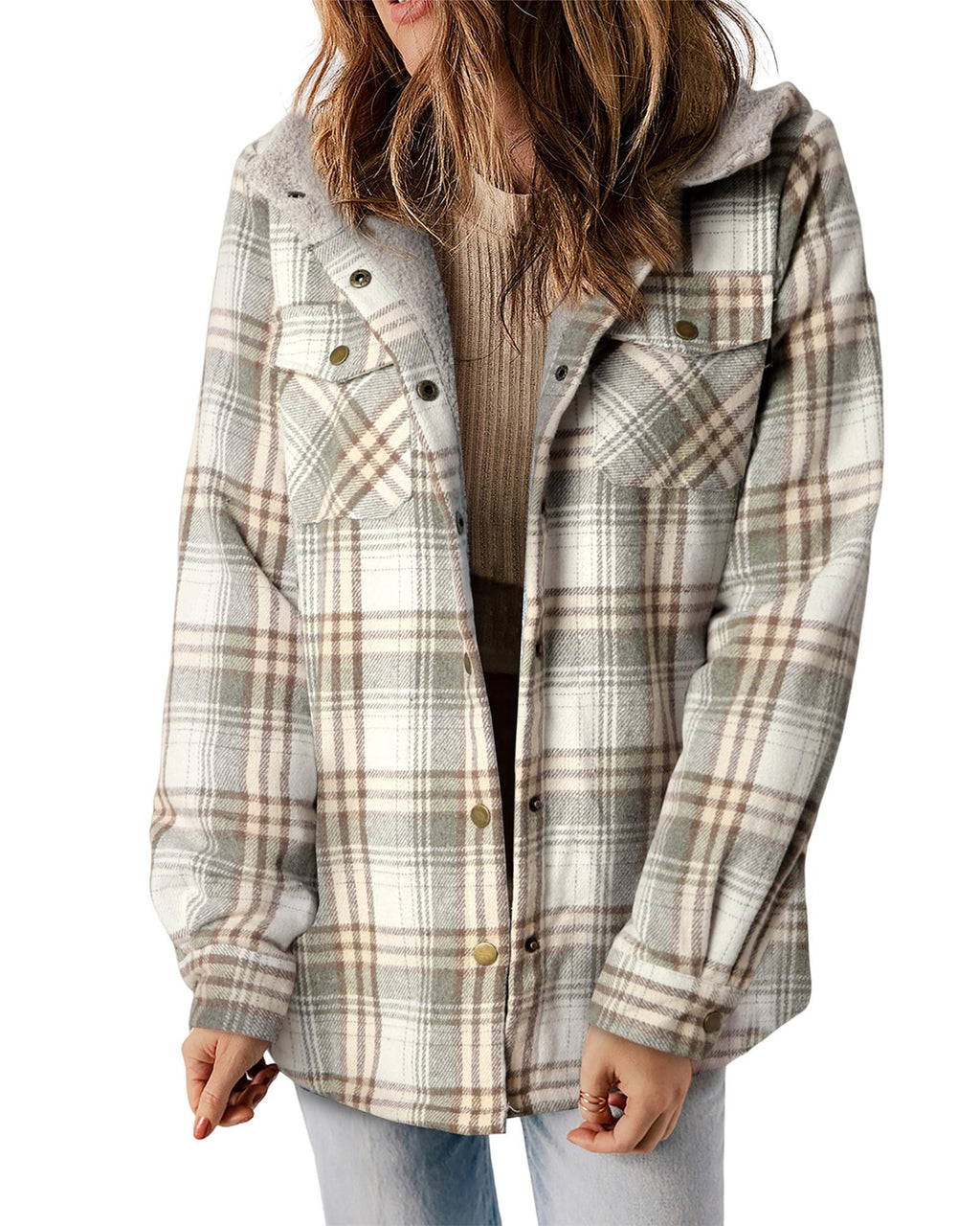 Gray Plaid Pattern Sherpa Lined Hooded Shacket - L