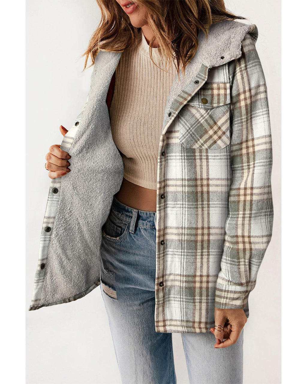 Gray Plaid Pattern Sherpa Lined Hooded Shacket - XL