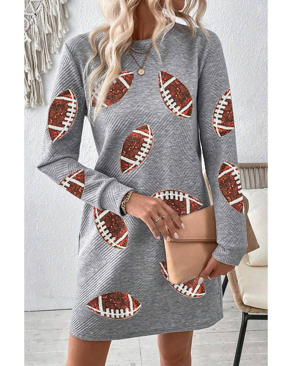 • Gray Sequin Rugby Football Graphic Textured Long Sleeve Shift Mini Dress