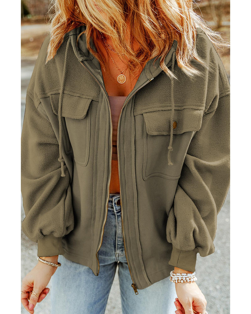 Green Flap Pocket Drawstring Hood Zip Up Jacket - L