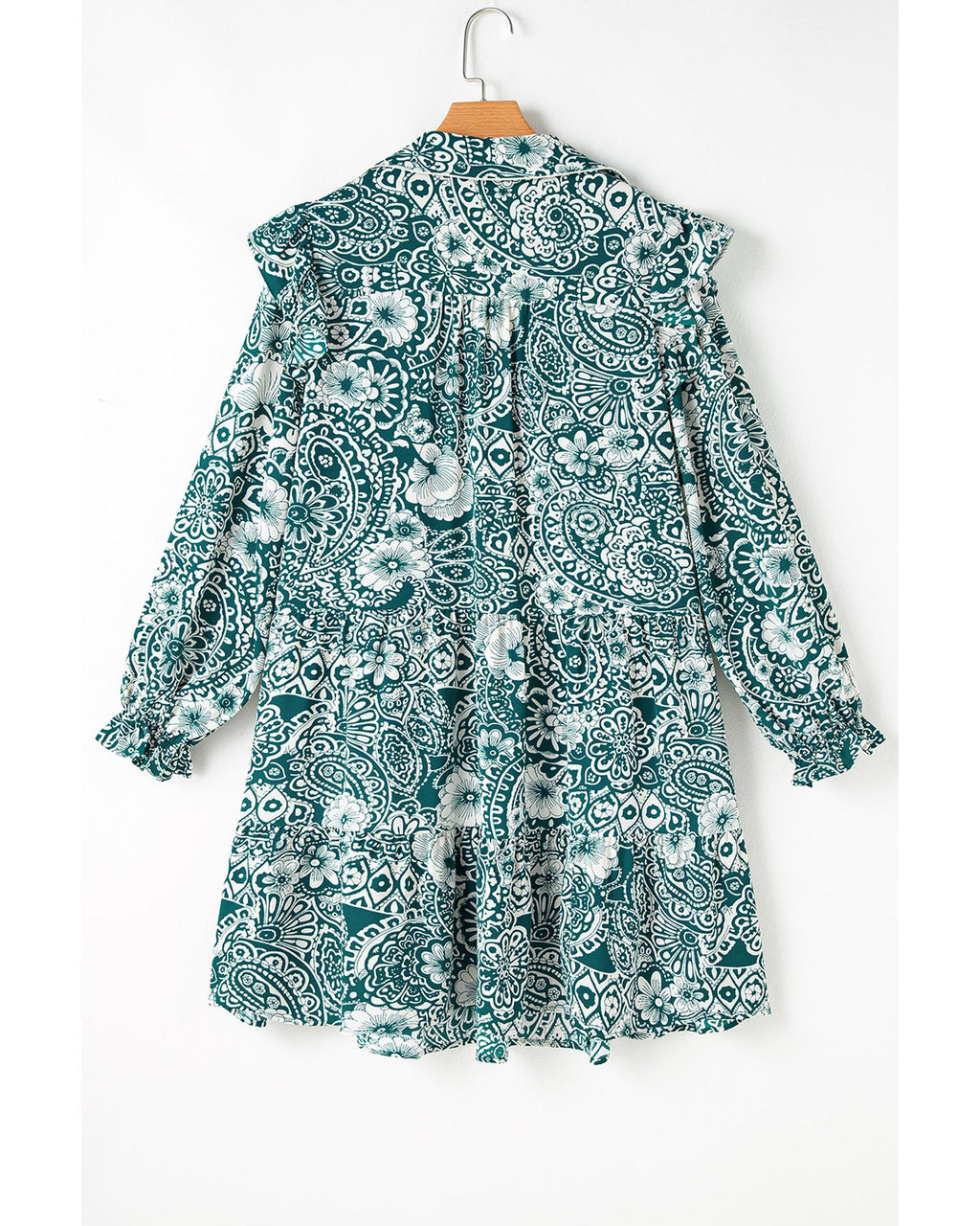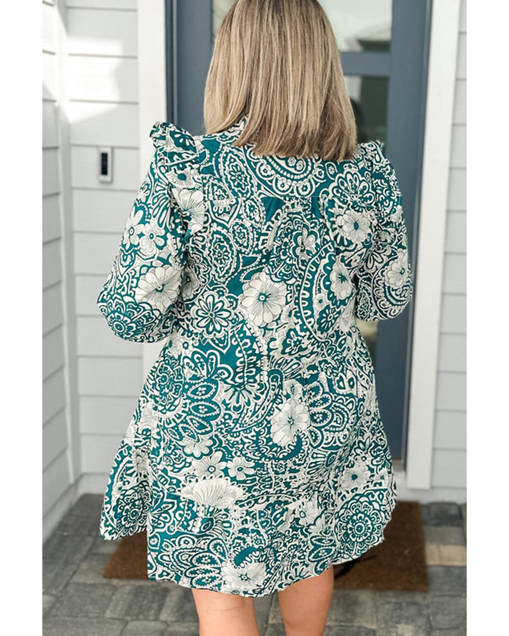Green Floral Flounce Sleeve Split Neck Plus Size Dress - 3X