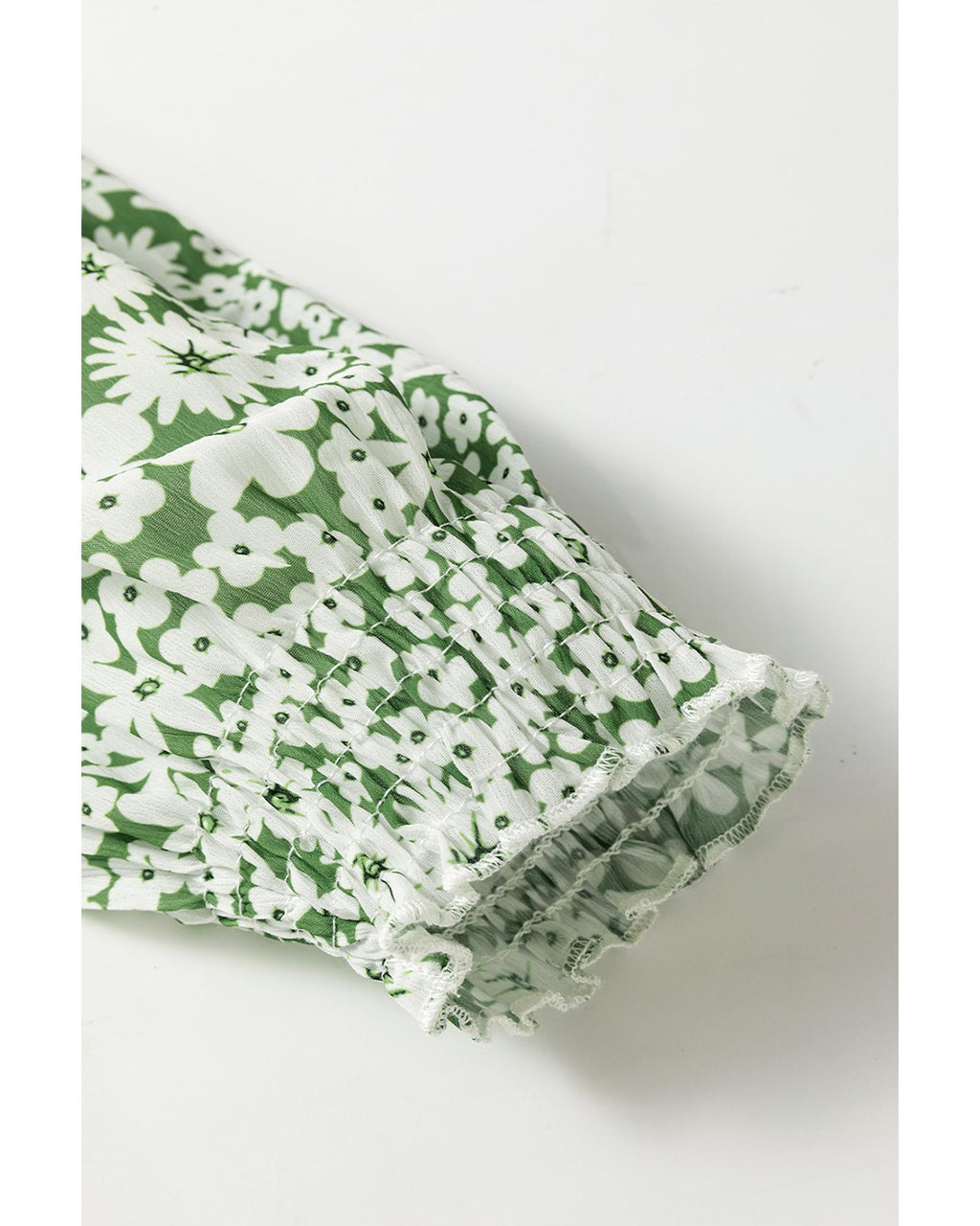 Green Floral Print Square Neck Shirred Waist Tiered Ruffled Mini Dress - XL