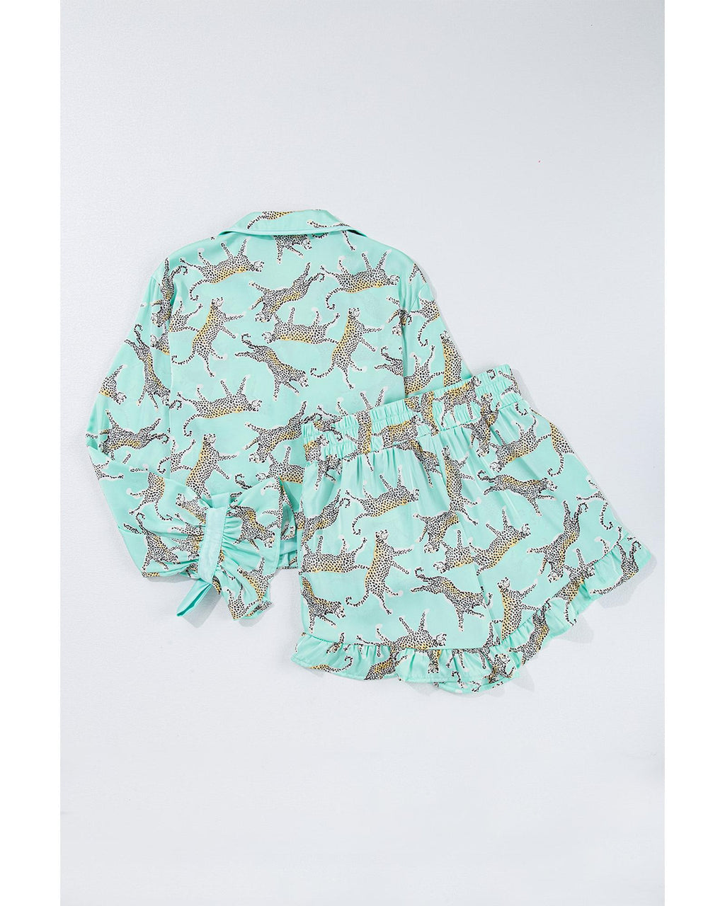 Green Leopard Satin Ruffle Pajama Short Set - M