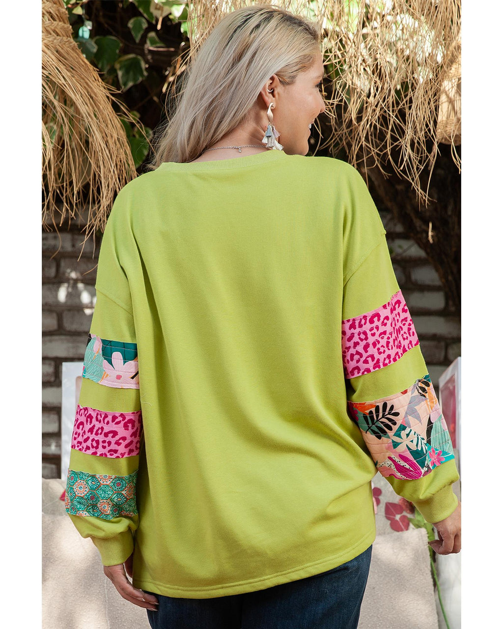 Green Plus Size Printed Patchwork Sleeve Split Sweatshirt - 3X