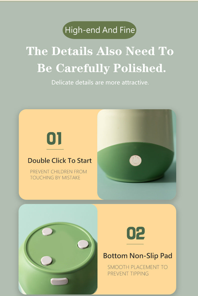 • Safe & Easy Operation: Incorporates a safety double-click start mechanism to prevent accidental activation. The wide mouth design makes adding ingredients simple, and the non-slip base pads ensure stability during use.