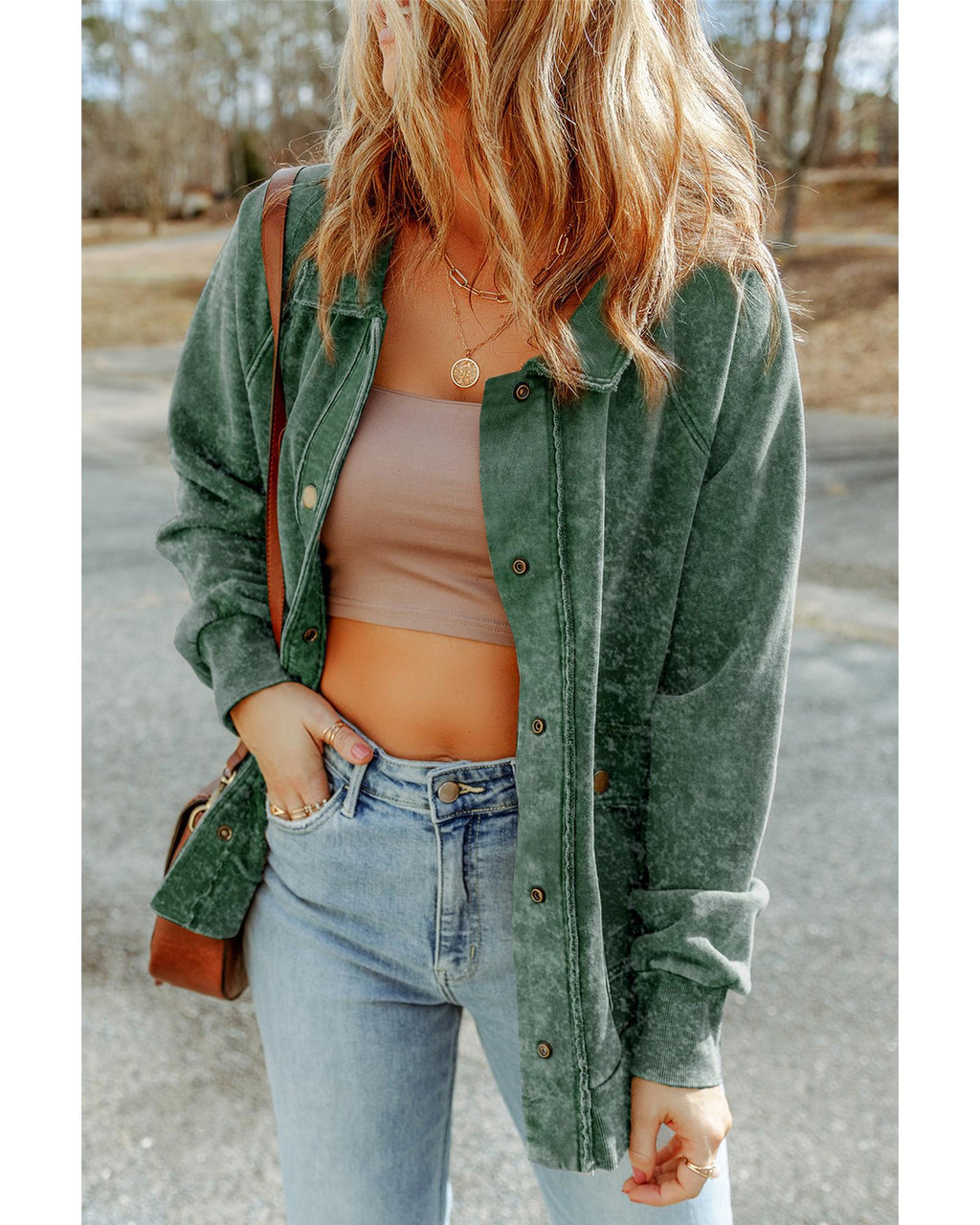 Green Vintage Washed Flap Pocket Button Shacket - L