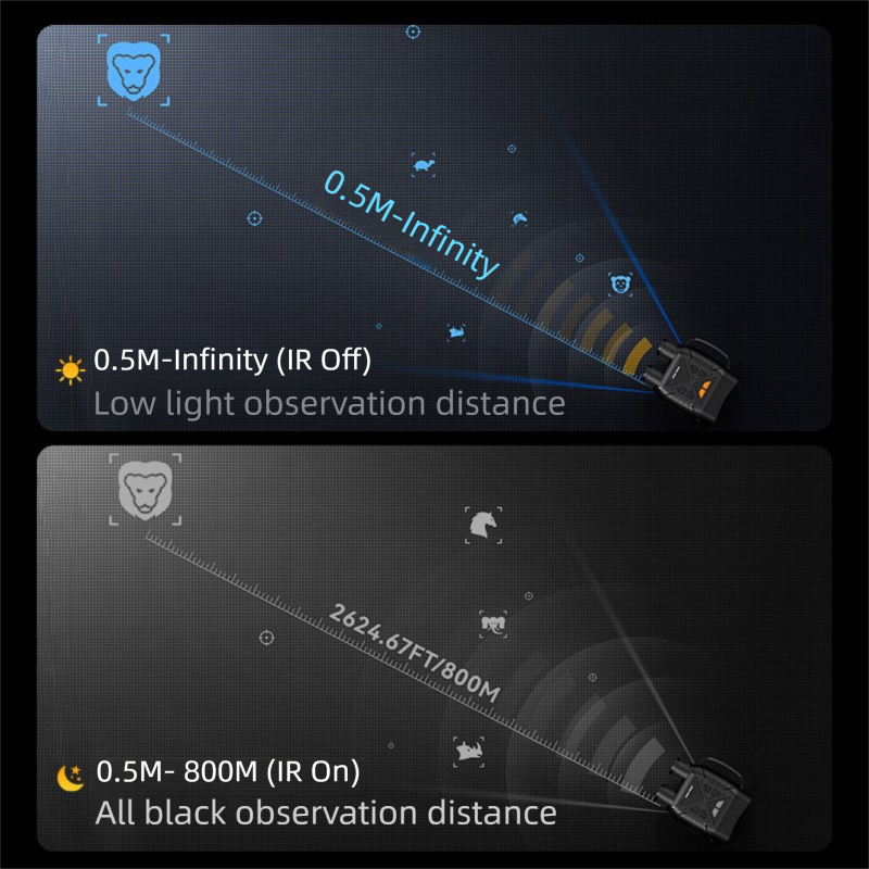 • Exceptional Observation Distance: Capable of viewing 0.5-800 meters in total darkness (Full Black), and from 0.5 meters to infinity in low-light or daytime conditions.