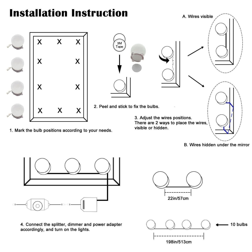 • @ FLEXIBLE TO INSTALL: Each hollywood lights comes with strong adhesive 3M tape stickers. Just peel and stick on to the mirror or the mirror frames. Its that easy! Moreover, an extra set of hook look sticker and screws will be supplemented in the makeup light fixture as alternatives.