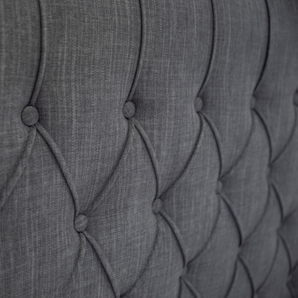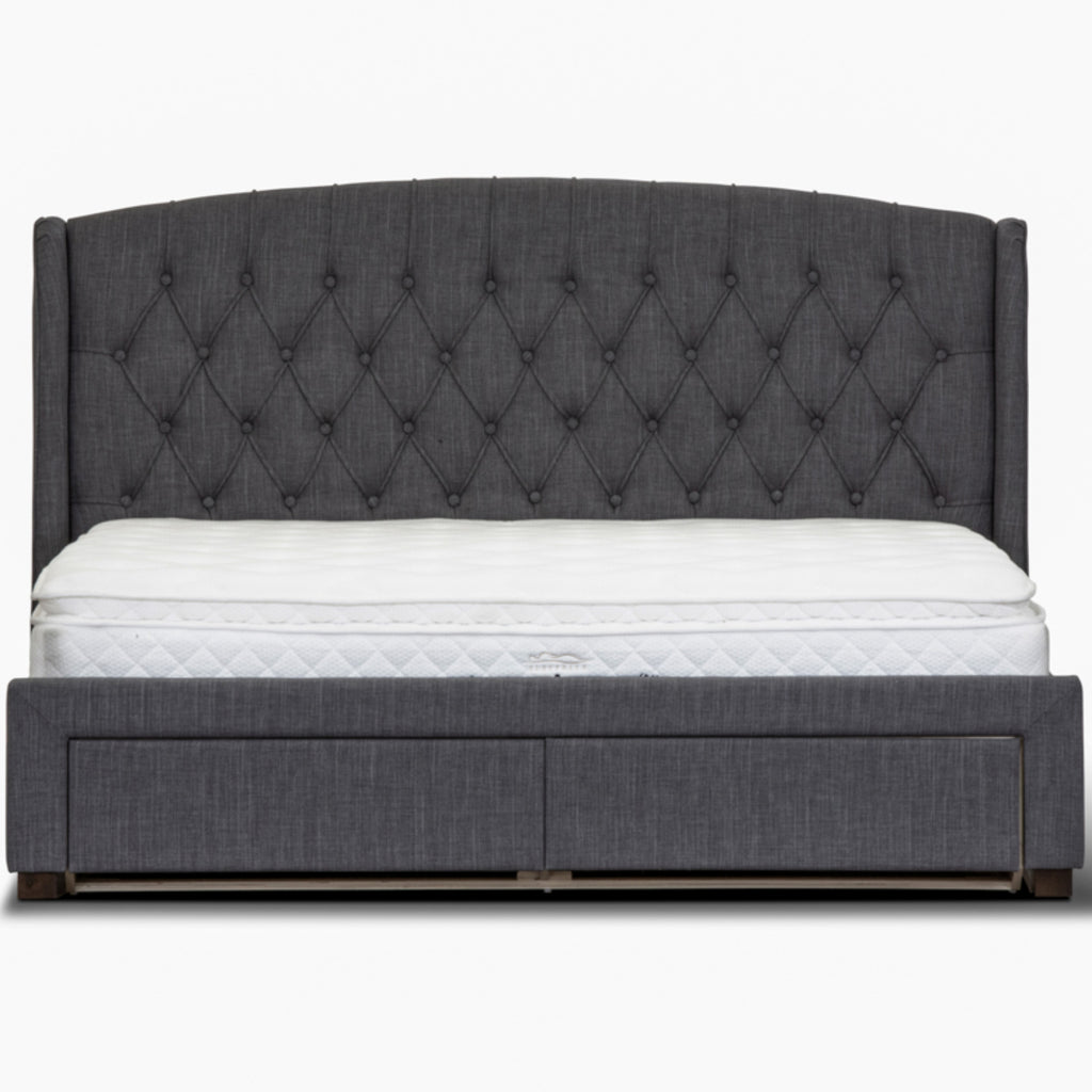 Now is the time to transform your bedroom into an ultra-luxurious retreat. Fill your personal space with this beautiful queen bed with 4 drawers having an eye-catching look and design. The magnificent furniture piece in dark grey colour is made of sustainably harvested MDF wood, and special particle board. MDF wood is known for its resilience to moisture damage and great strength. Fully upholstered in soft polyester, the bed features thick foam and a comfortable bedhead with tufting and classy details. Robust legs made of rubber wood, strong slats, and central support provide the bed with toughness and great durability. The slats give it an excellent weight-bearing capacity. Not only that, 4 spacious drawers - 2 footboard drawers and 2 side drawers' maximize storage space, giving the bed great usability. All the drawers have full metal extension runners that help you keep the room tidy and well organized. The queen-size bed that goes well with a variety of interior decor styles comes with a one-year warranty.