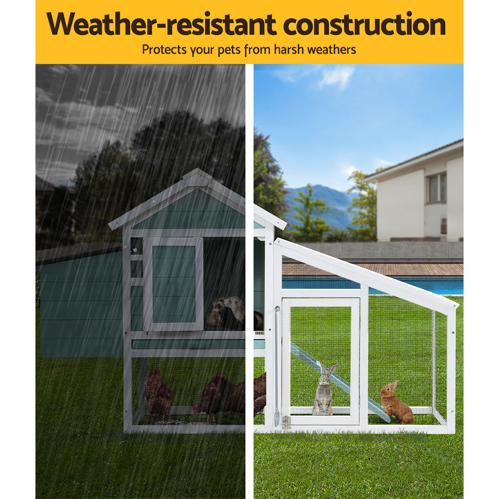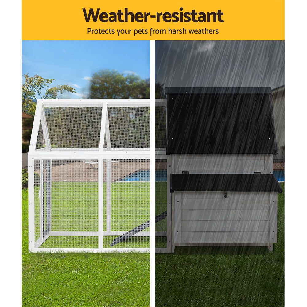 Give your beloved pets a safe and comfortable home to sleep, rest, play, and relax. The i.Pet's pet hutch makes a cosy home for your dear pets they will love and cherish forever. This pet hutch is suitable for smaller pets such as rabbits, chickens, hens, guinea pigs, hamsters, chinchillas and ferrets. Our pet hutch features a solid fir wood construction with galvanised mesh that ensures its sturdiness and durability for many years. It has a stable and firm base with strong metal support rod that's crucial for stability. Our pet hutch has green asphalt felt roof that provides good protection from sun and rain, keeping them cool in summer and warm in winter. It has a spacious integrated ground enclosed play area that allows your pets to have a great playtime outdoors. And the built-in foldable ramp that connects the ground area and hutch enables convenient entry and exit. Furthermore, the pet hutch also comes with a hatching box for egg collection and a slide-out tray for easy cleaning, and the entrance door with sturdy security locks makes it even more convenient and reliable. The enclosed play area has a mesh structure, which keeps your pets comfortable and well-ventilated. This pet hutch will give your beloved pets the utmost joy and pleasure. Gift this pet hutch to your pets today, and be sure to get much love in return.