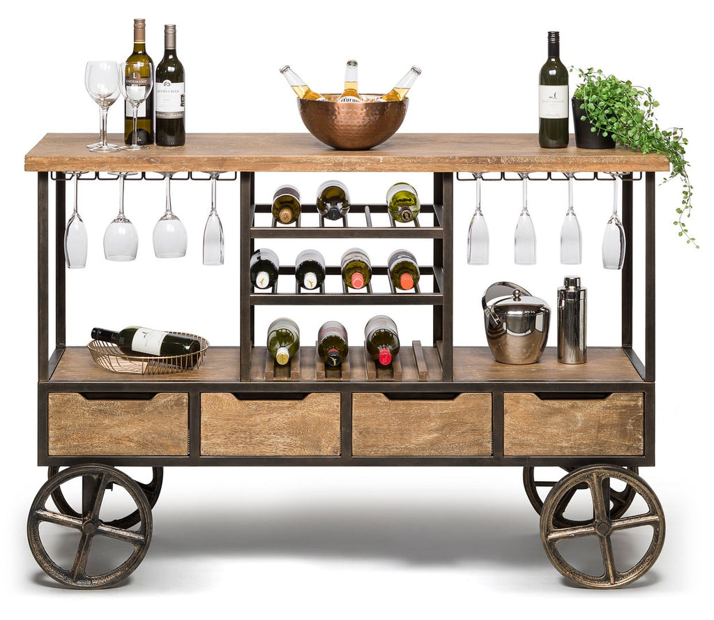 This Industrial Style Wooden Bar Cart Drinks Trolley Station with Wine Bottle Rack makes entertaining an absolute delight. With more Storage than ever, this Drinks Trolley has enough Space to please the entire crowd. With Wine Glass Holders, 3-tier Wine Rack and 4 Storage Drawers, this Bar Cart is the ultimate entertaining powerhouse. Furthermore, add a touch of Industrial appeal to your interior space as the Wood construction alongside the Iron Structure and Wheels bring back the Retro look. This Bar Trolley is perfect for your entertaining space. And with such a versatile design, this Bar Cart can also be used as a Kitchen Island Trolley. The options are truly endless!