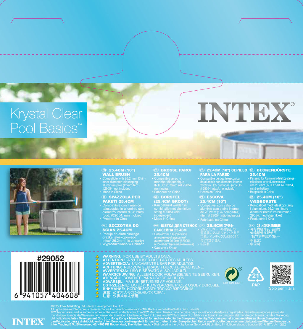 • Easily and quickly remove algae and grime from pool walls or the pool floor with the Intex 10in Wall Brush, ideal for pool cleaning and maintenance.The brush is compatible with the 1-1/16in inner diameter telescoping aluminum shaft (sold separately).Straight standard brush for pool cleaningQuickly remove algae and grime from pool walls or floorCompatible with 26.2mm inner diameter telescoping aluminum pole (item# 29054, sold separately)