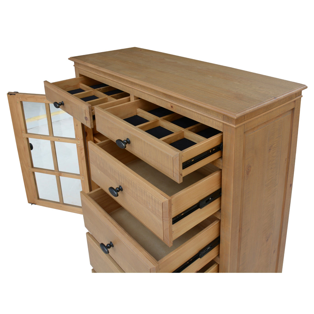 - 6 sizable drawers and 1 panelled glass door in the tallboy