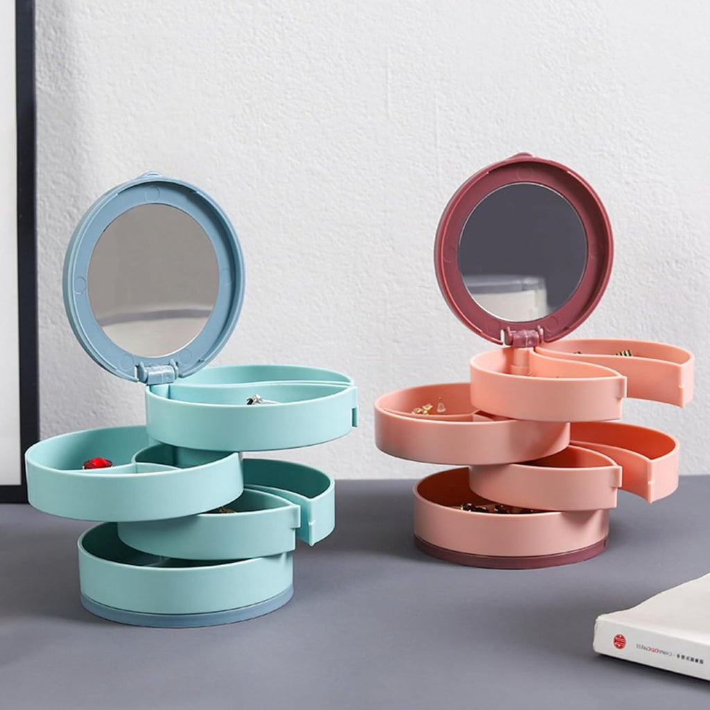 This rotating jewelry storage box with mirror is a practical organizer for keeping your favorite jewelry neatly organized - ideal for dressers, bedrooms, bathrooms or as a gift for jewelry lovers.