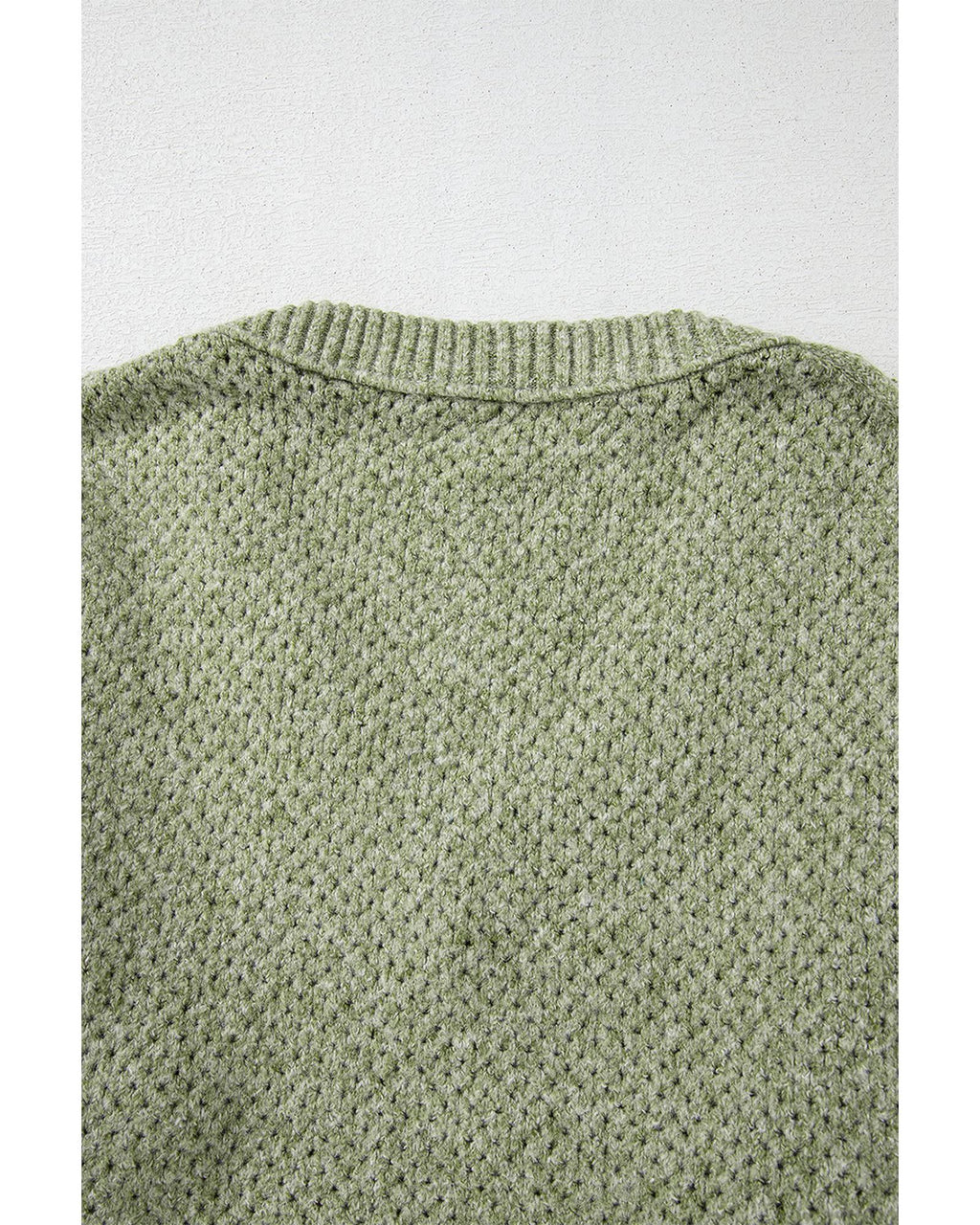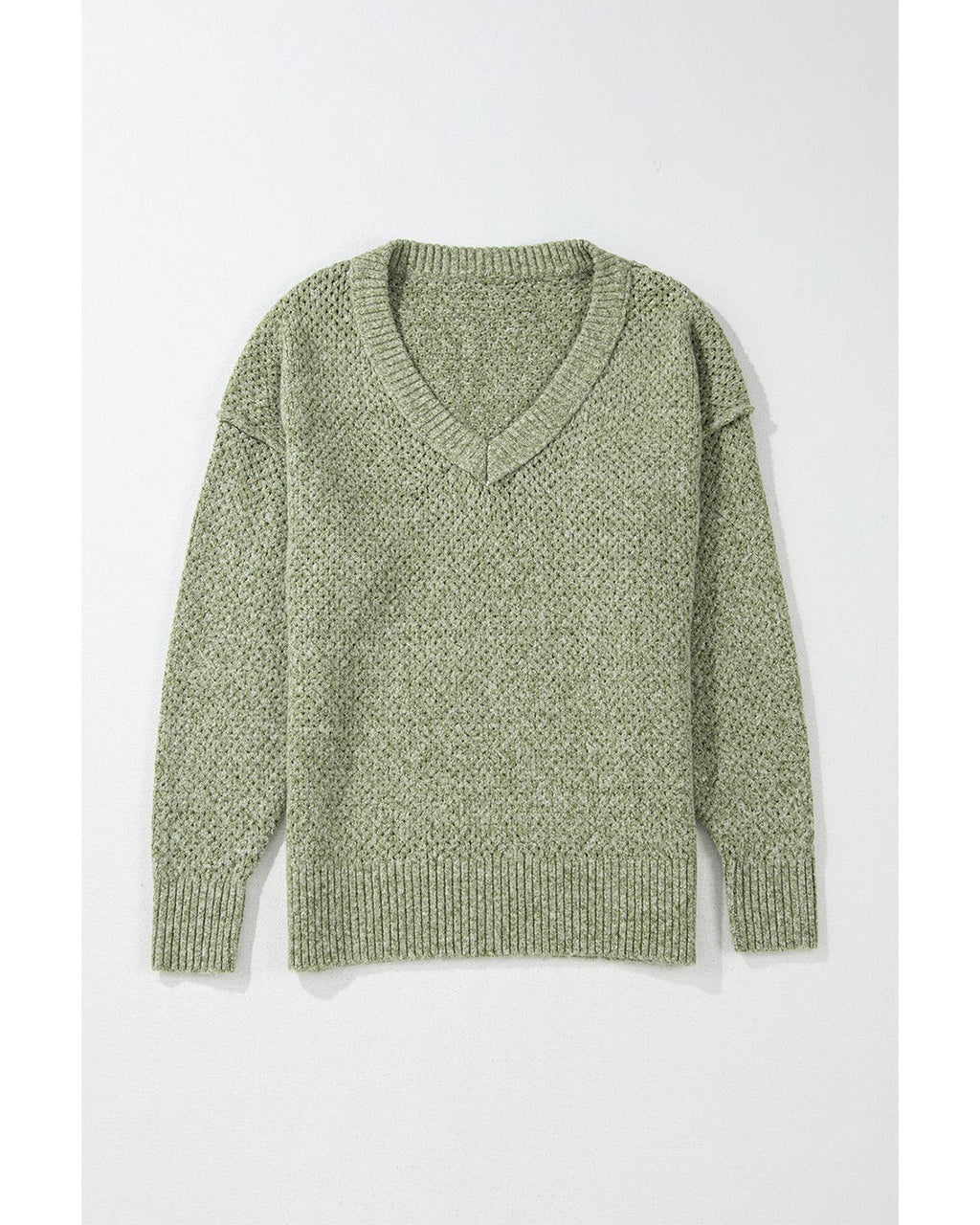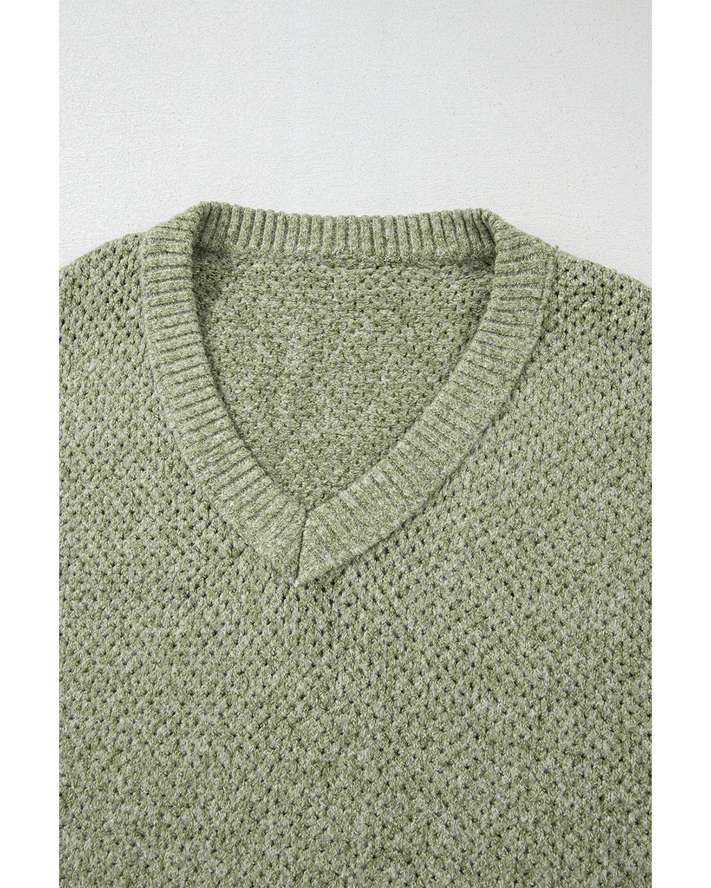 Jungle Green Loose Eyelet V Neck Drop Shoulder Sweater - M