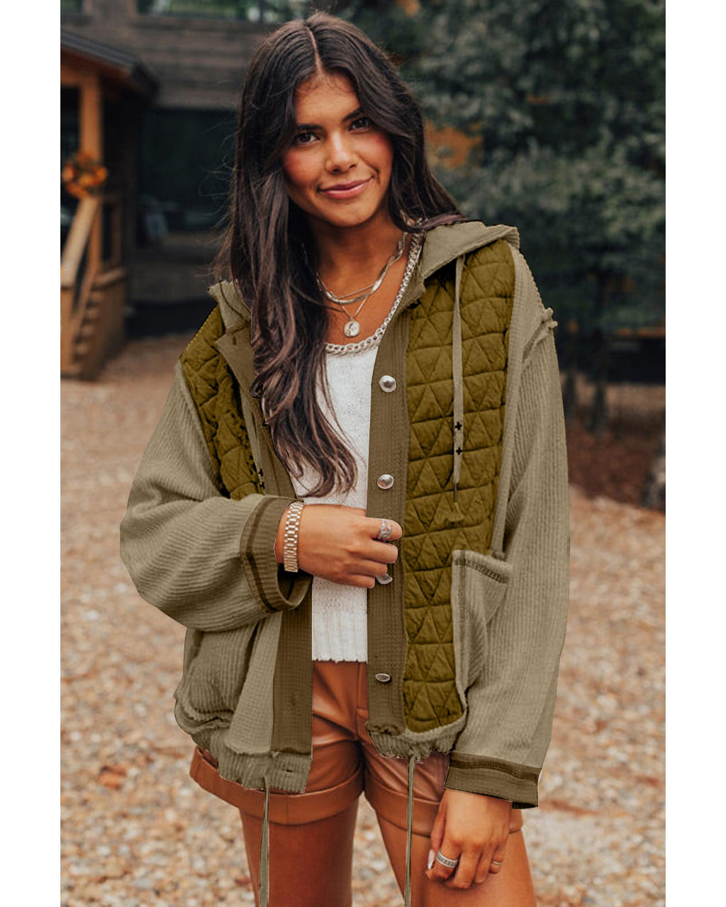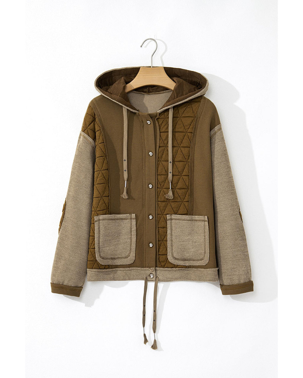 • Jungle Green Quilted Textured Patchwork Loose Fit Hooded Jacket