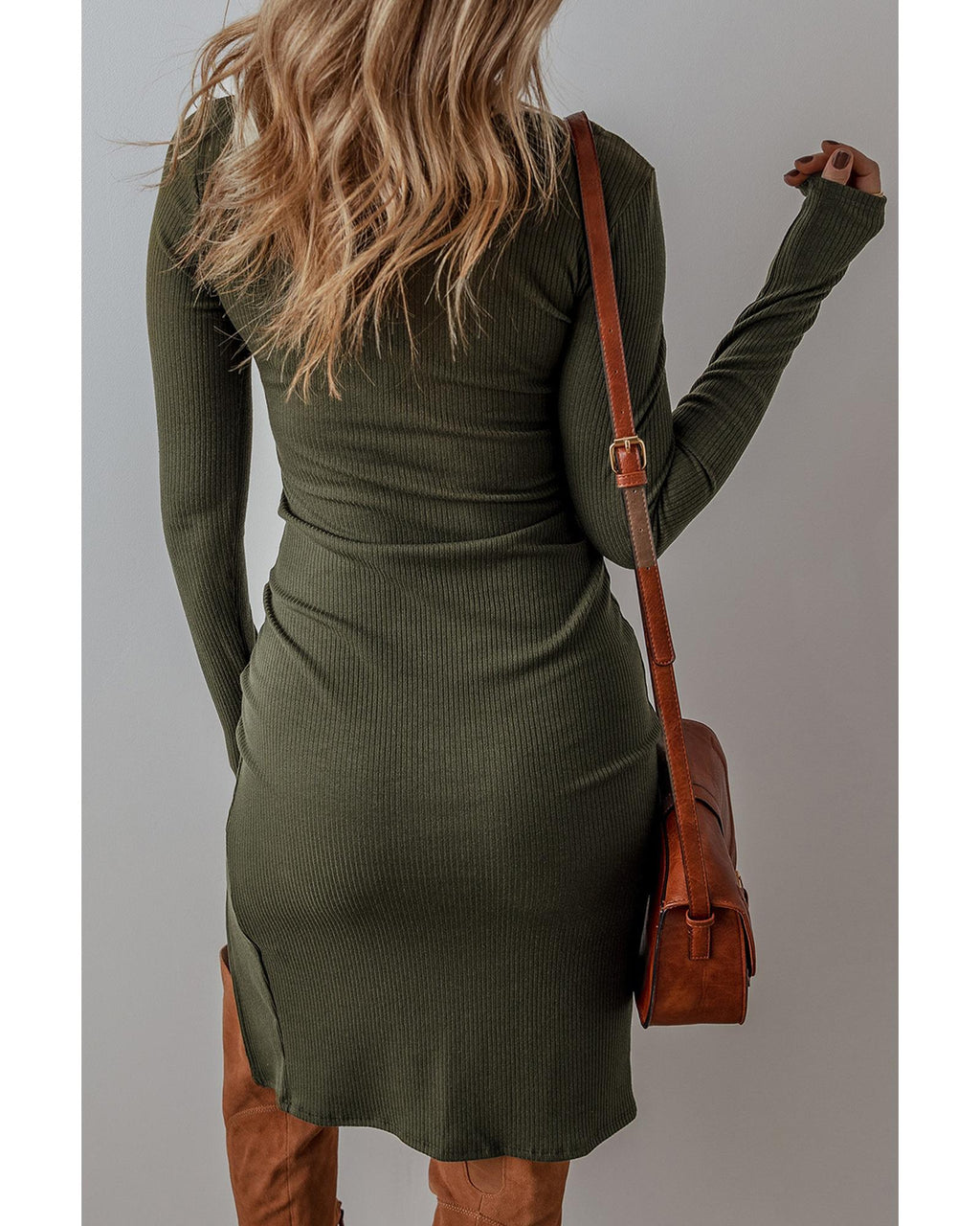 Jungle Green Ribbed Side Slit Ruched Slim Fit Long Sleeve Mini Dress - L