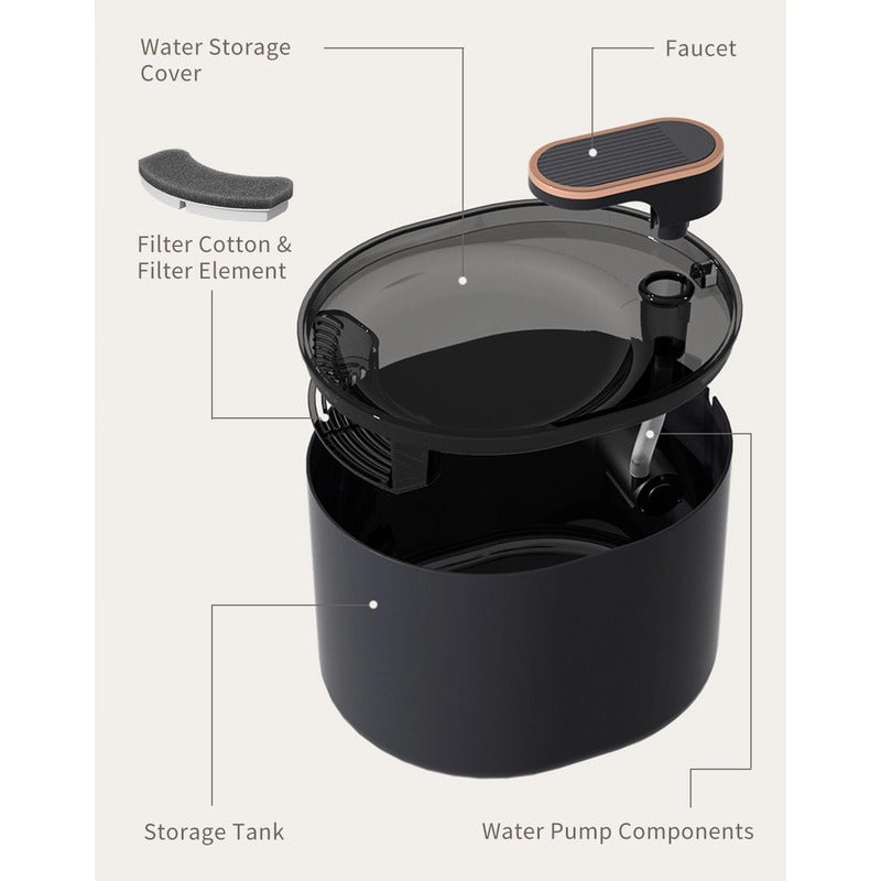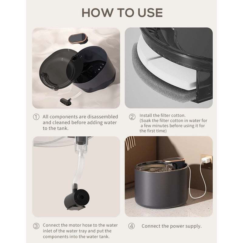 Super Silent Water Dispenser. This pet water fountain barely makes noise, which will not disturb you even running in the bedroom at night. Safe Cat Fountain with 1 Activated Carbon Filter. To ensure that your cats and dogs always have clean drinking water, we selected a food-grade filter, consisting of a PP cotton layer and activated carbon, which can get rid of 99% of impurities. This cat water fountain is also BPA free, durable, easy to operate, and clean.
