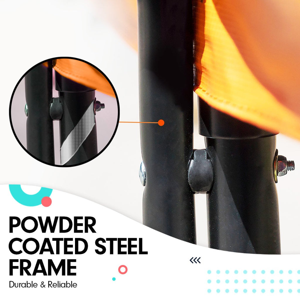 This is a heavy trampoline and uses linked legs and grounding straps for superior stability. The structure of the legs also minimises the tendency for legs to dig into the ground. Legs also feature re-enforced joint bars to enhance strength and stability.