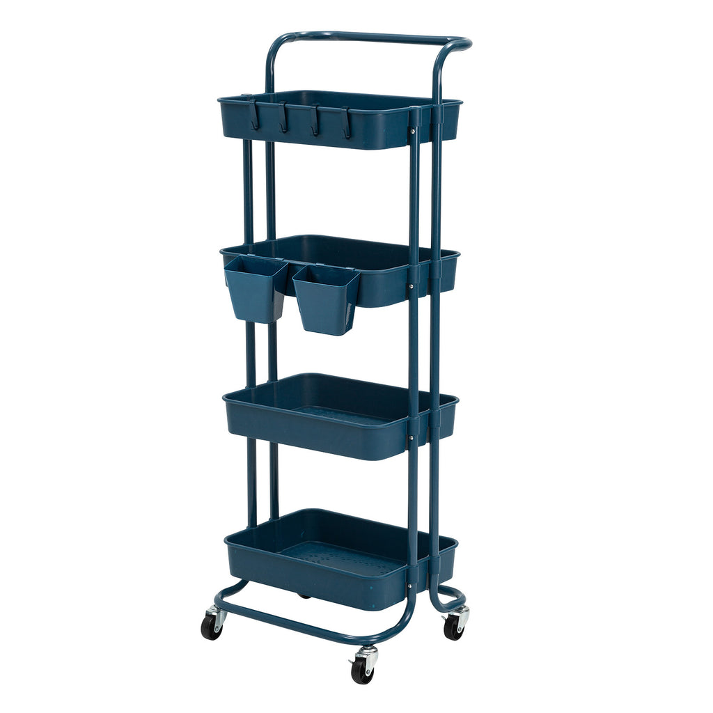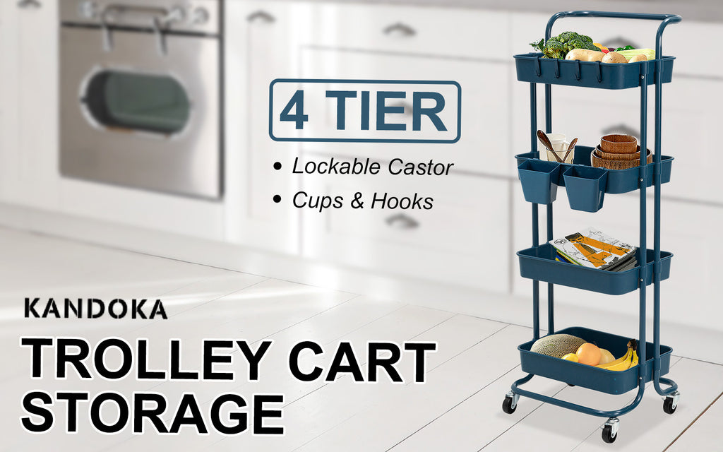 Kandoka Trolley Cart Storage Utility Rack Organiser Swivel Kitchen 4 Tier - Blue