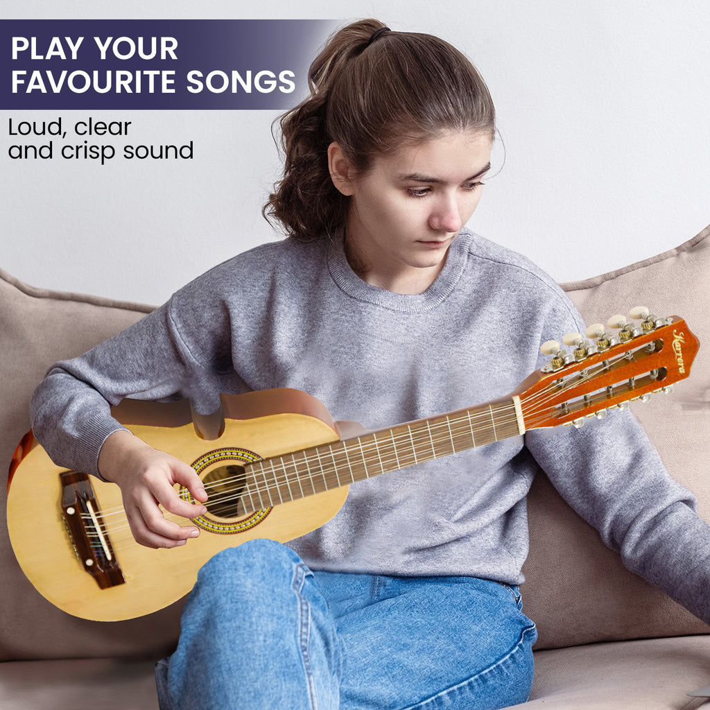This guitar has a built-in worm-drive geared tuner to configure the sound however you like. It's also fitted with steel strings so it's easier to play for beginners and budding musicians looking to play a new unique instrument.