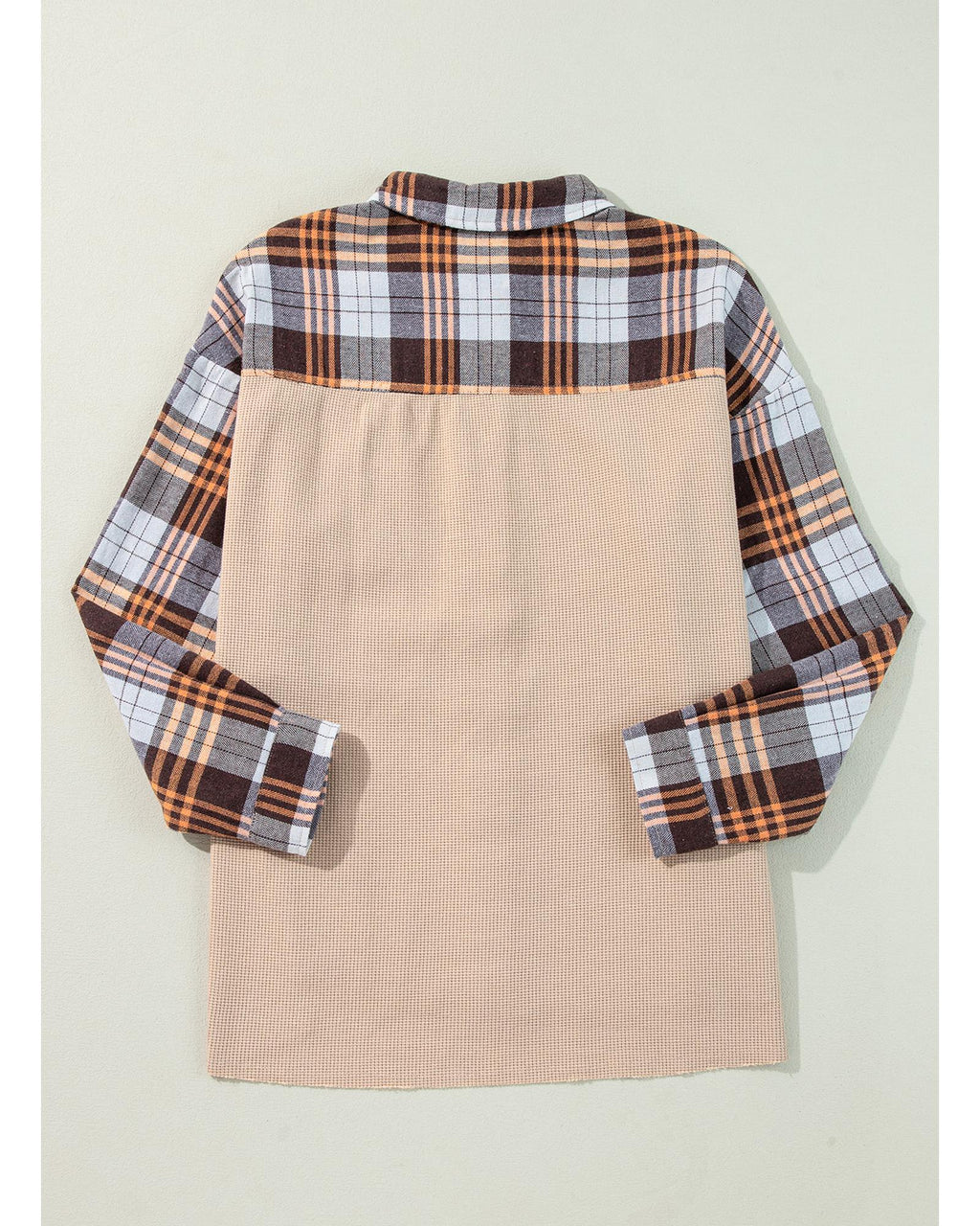 Khaki Thermal Knit Plaid Patchwork Shacket - M