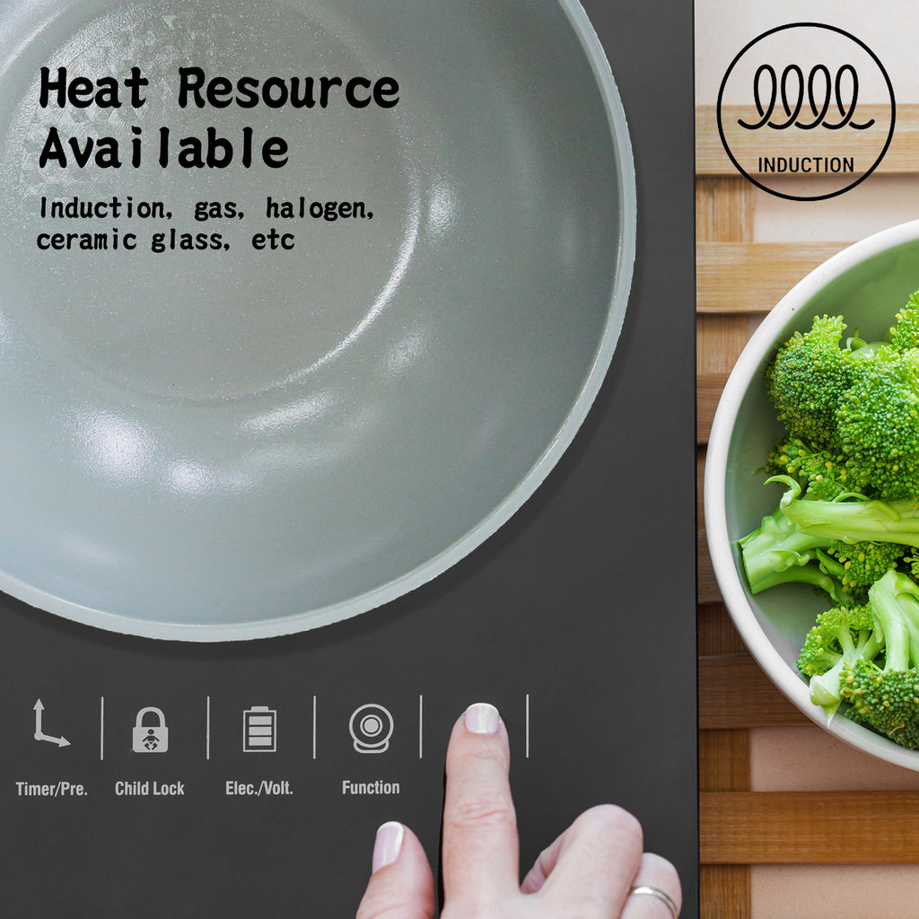 Nontoxic eco-friendly ceramic coating that is PFOA and PTFE free for healthy cooking. The wok is made with a flat bottom which allows it to be placed evenly over the heat source and is suitable for use on most stovetops including induction, gas, halogen, ceramic glass, etc; Dishwasher safe.