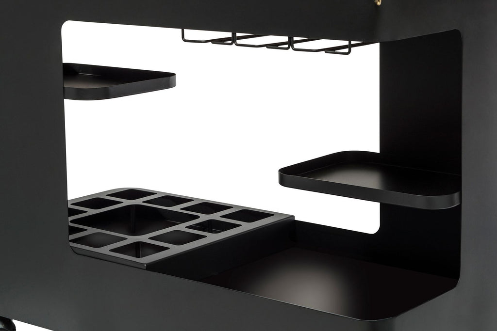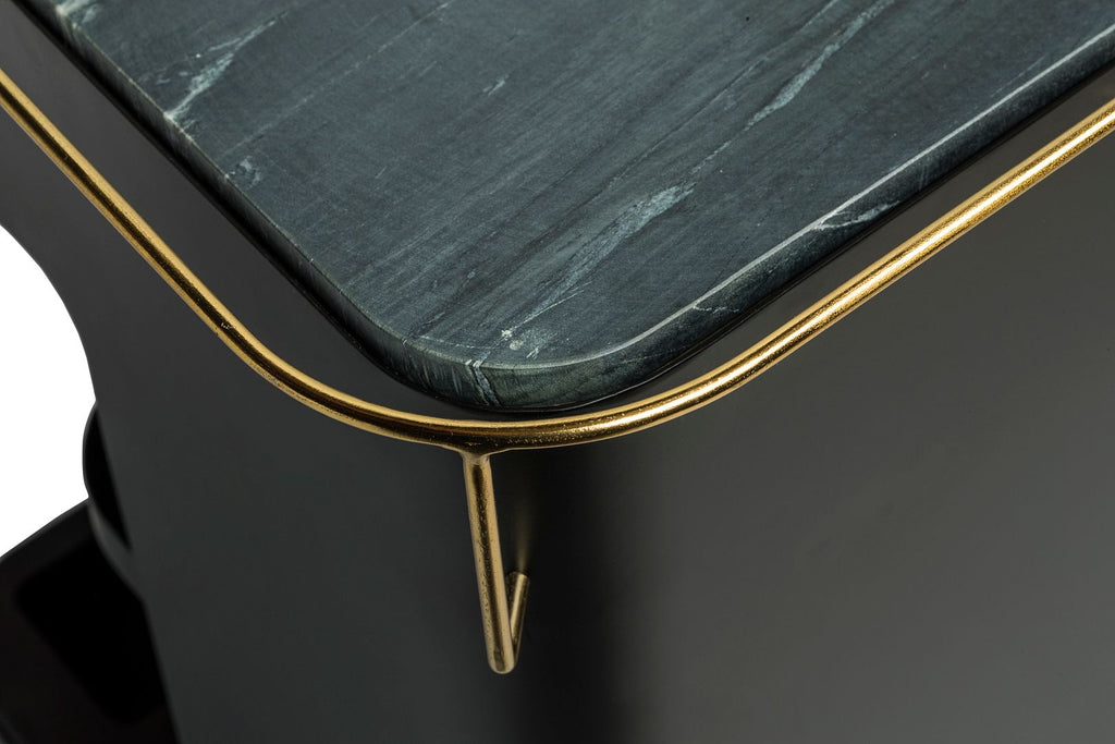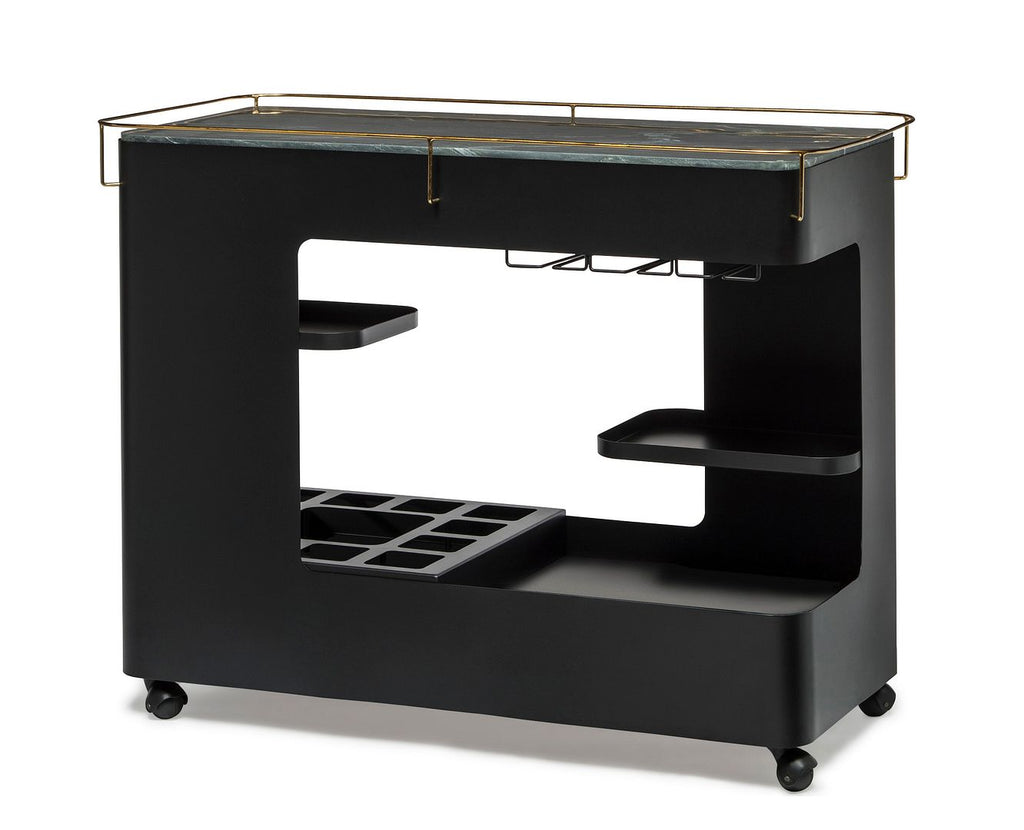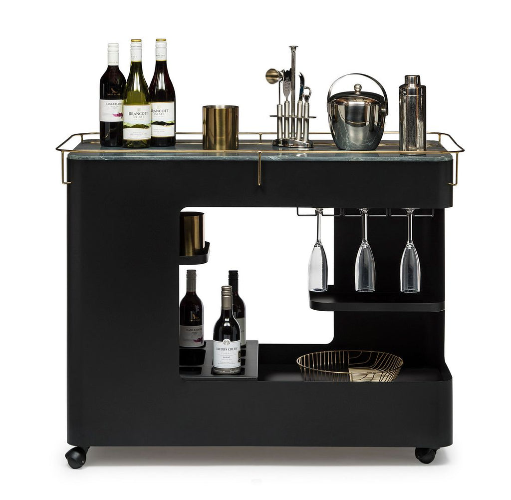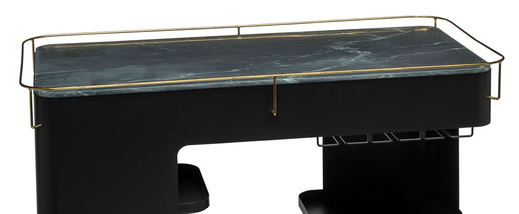 This inspiring Large Contemporary Black Gold Drinks Trolley Bar Cart with Marble Top and Stemware Rack is designed for todays urban living and provides a unique space for all your Bar essentials. With a luxurious Black Iron frame, this Drinks Trolley oozes class. Possessing a multi-levelled structure and a Marble Shelf Top, this Cart will be the powerhouse of your Home Bar. With the added convenience of Wheels, Wine Glass Holders and built-in Stemware Racks, this versatile Cart is perfect for showing off your exquisite collection of Wines, Spirits and Cocktail Accessories.