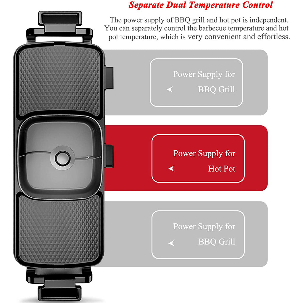 Electric grill equipped with Shabu Shabu hot pot, making barbecue and hot pot combined in an innovative way, adding more fun to your leisure time. One machine meets your dual demand, making the barbecue and hot pot combined together and the hot pot is equipped with the divider for two taste.