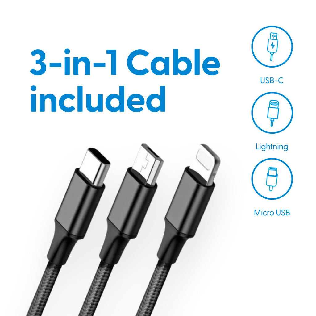 • 3-in-1 Cable Included: Charge multiple devices with USB-C, Micro USB, and Lightning compatibility all from one cable.