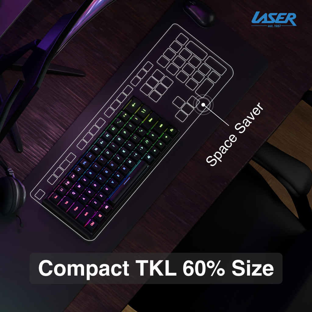 The popular 60% keyboard form factor (that's 60% of the size of a full-sized keyboard) represents a minimalist design with a space-saving layout. The important keys are close to where your fingers naturally rest so that you can get more done in less time and greater comfort.