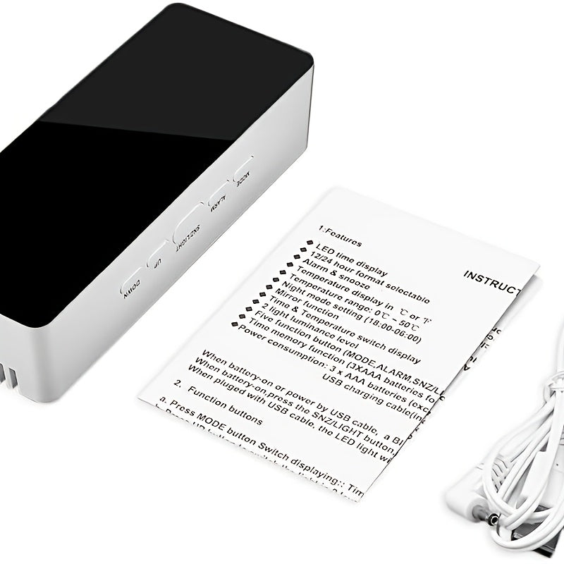 This multifunctional smart clock features a minimalist design with dimensions of 14cm 5.5cm 3.5cm (length width thickness). It integrates a clock, alarm, temperature display, night light, and USB power supply into one compact unit, making it a practical and convenient desk companion.