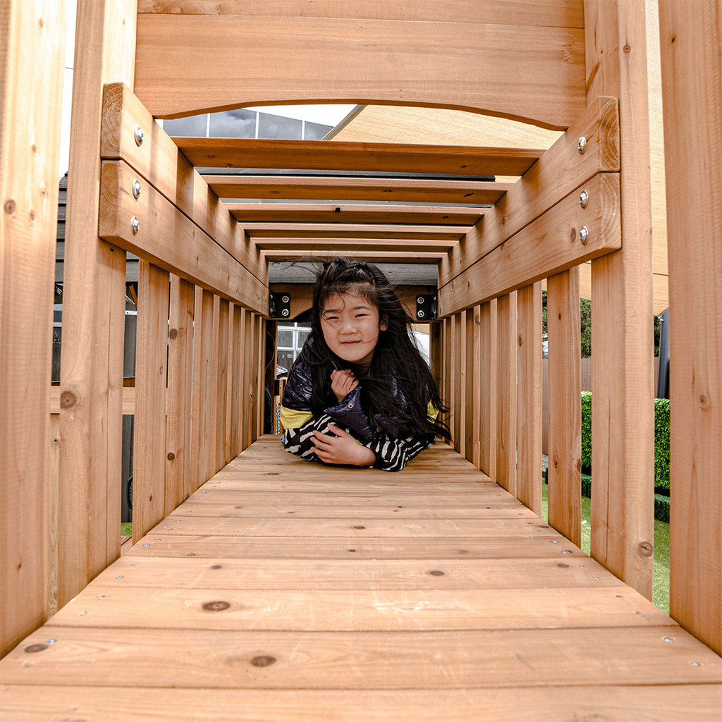 Reach new heights with the Kensington Play Centre Set, a unique and thrilling choice for backyard adventures that captivate Aussie kids. This exceptional playset is packed with features, including the elevated crow's nest where kids can ascend through a tunnel and into the spacious playhouse. The set includes a 2.2m wavy slide for exhilarating rides, a 2-position swing beam and monkey bars that connect seamlessly to the playhouse for added excitement. Below, a hideaway area features a picnic bench and snack window, inviting imaginative play. With a sturdy timber roof that enhances both durability and charm, the Kensington Play Centre is rigorously tested to Australian Standards, ensuring a safe and engaging environment for children. This play centre promises endless fun and adventure, making it the perfect addition to any backyard.