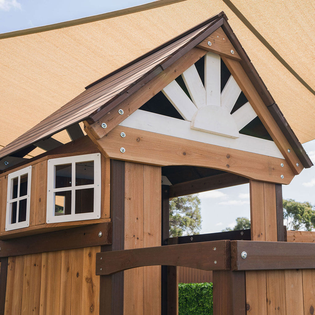 The Meer Brook Play Centre is a versatile and fun-filled play centre with a range of classic playground activities that will keep your little ones endlessly entertained. The L-shaped design ensures that the play centre makes the most of your backyard space and is especially handy for square backyards. Featuring a 2.2m wavy slide, a 3-position swing beam with two swings and a trapeze, and monkey bars connecting to an upper play fort, the Meer Brook offers a comprehensive backyard play space that any child will love.