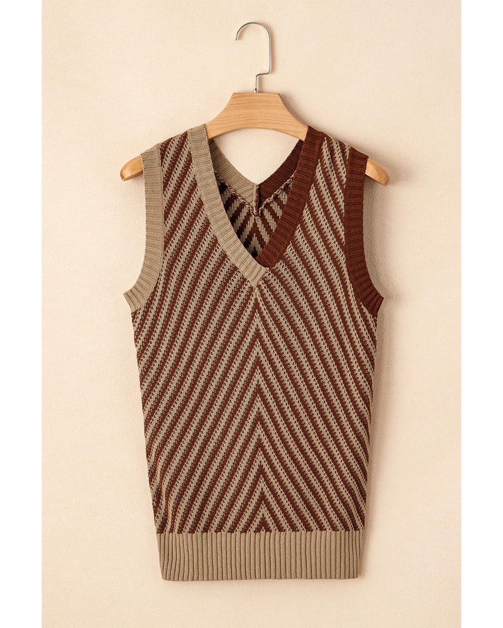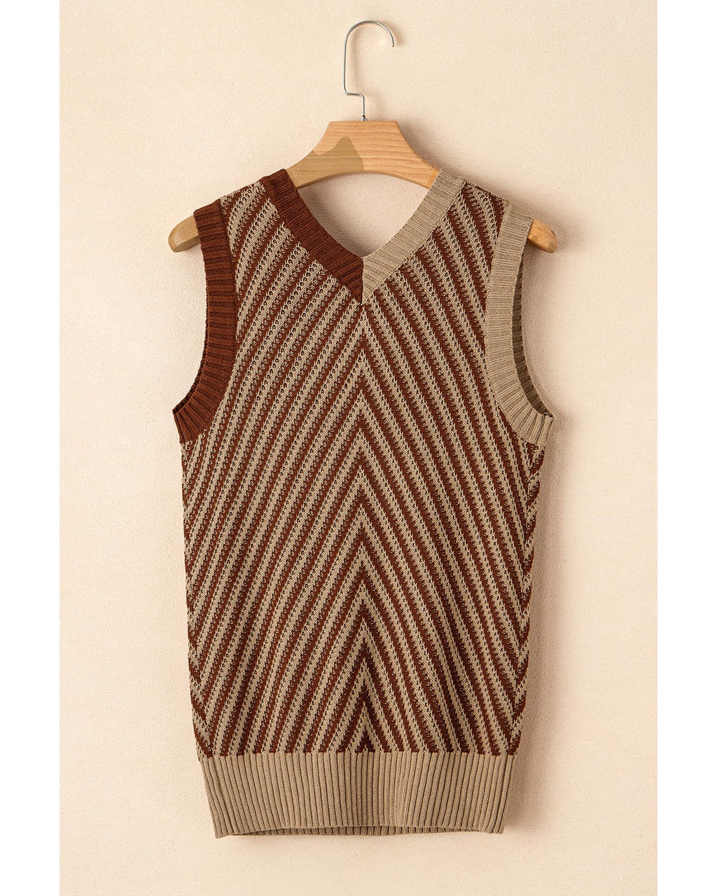 • Light French Beige Contrast Chevron Knit V Neck Sweater Vest