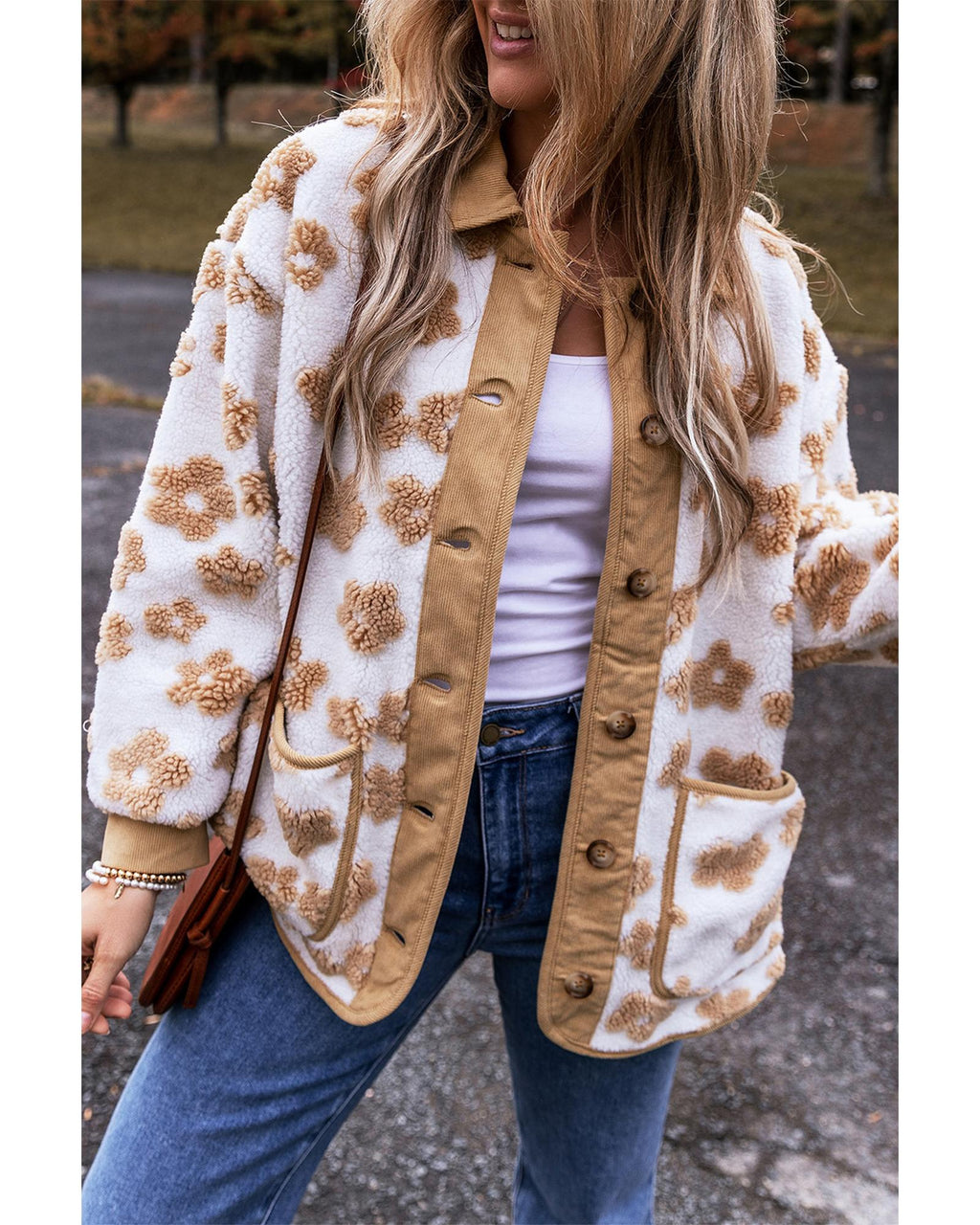 Light French Beige Cute Flower Pattern Button Up Fleece Jacket - S