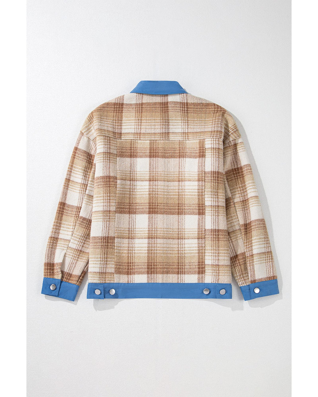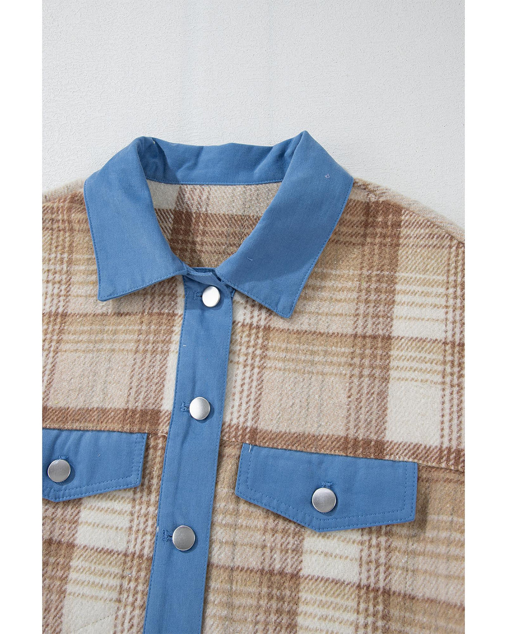 Light French Beige Plaid Patchwork Flap Detail Button Up Shacket - XL