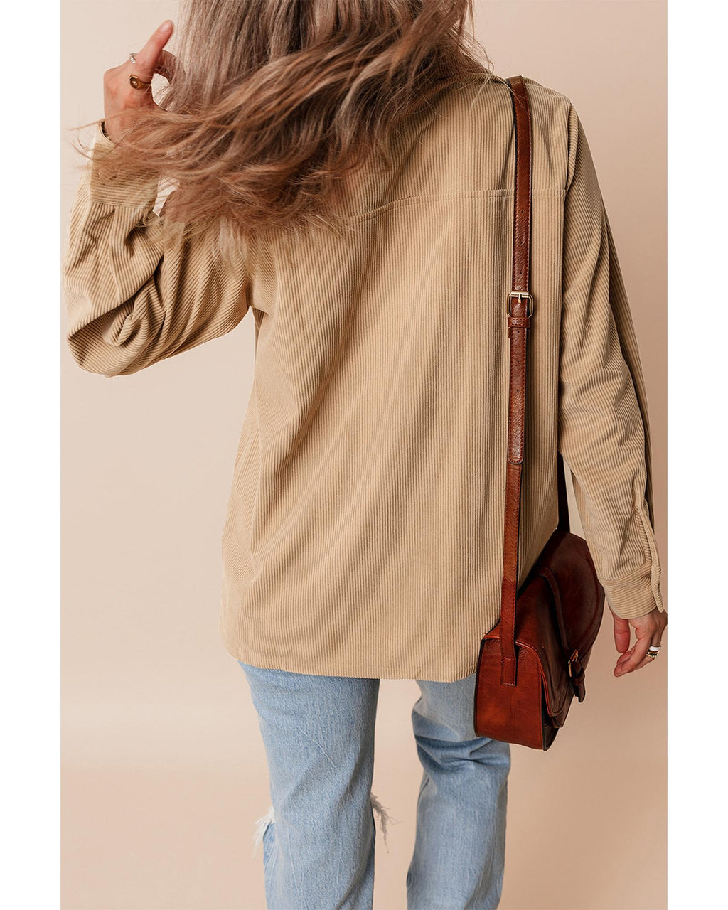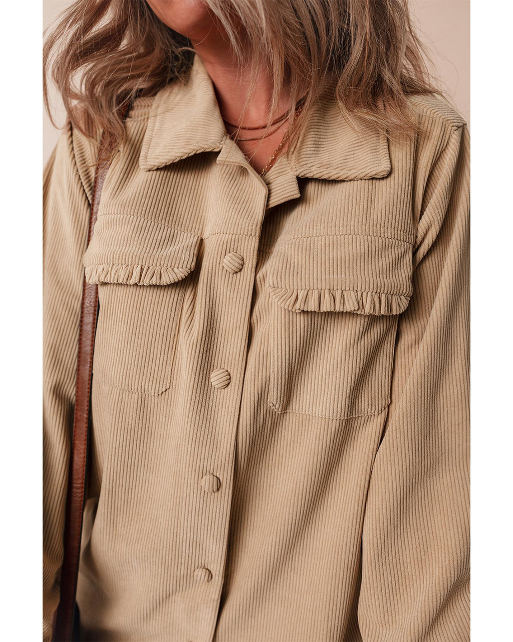 Light French Beige Solid Frilled Flap Pocket Button Up Corduroy Shacket - XL